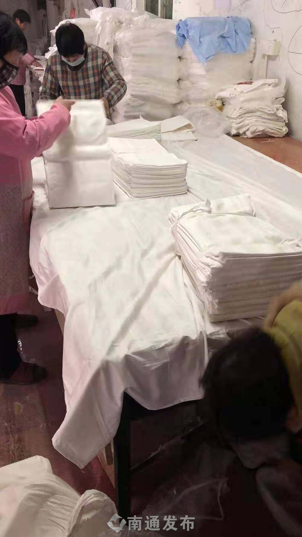 2月3日,在我市通州区党委和政府、张芝山镇党委镇政府、张芝山工业园区、当地新型冠状病毒感染的肺炎疫情防控工作指挥领导小组等方方面面关心下,受国药控股公司委托为武汉雷神山医院生产配套医疗纺织品的宣娇百年纺织品有限公司,紧急开工、加班生产,确保为医院医护人员、后勤职工、入院患者使用的被褥、被罩等医用纺织品在规定时间内生产到位。