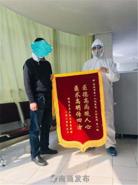 图为患者孟先生向市一院口腔科主任医师李一桃送上锦旗致谢。