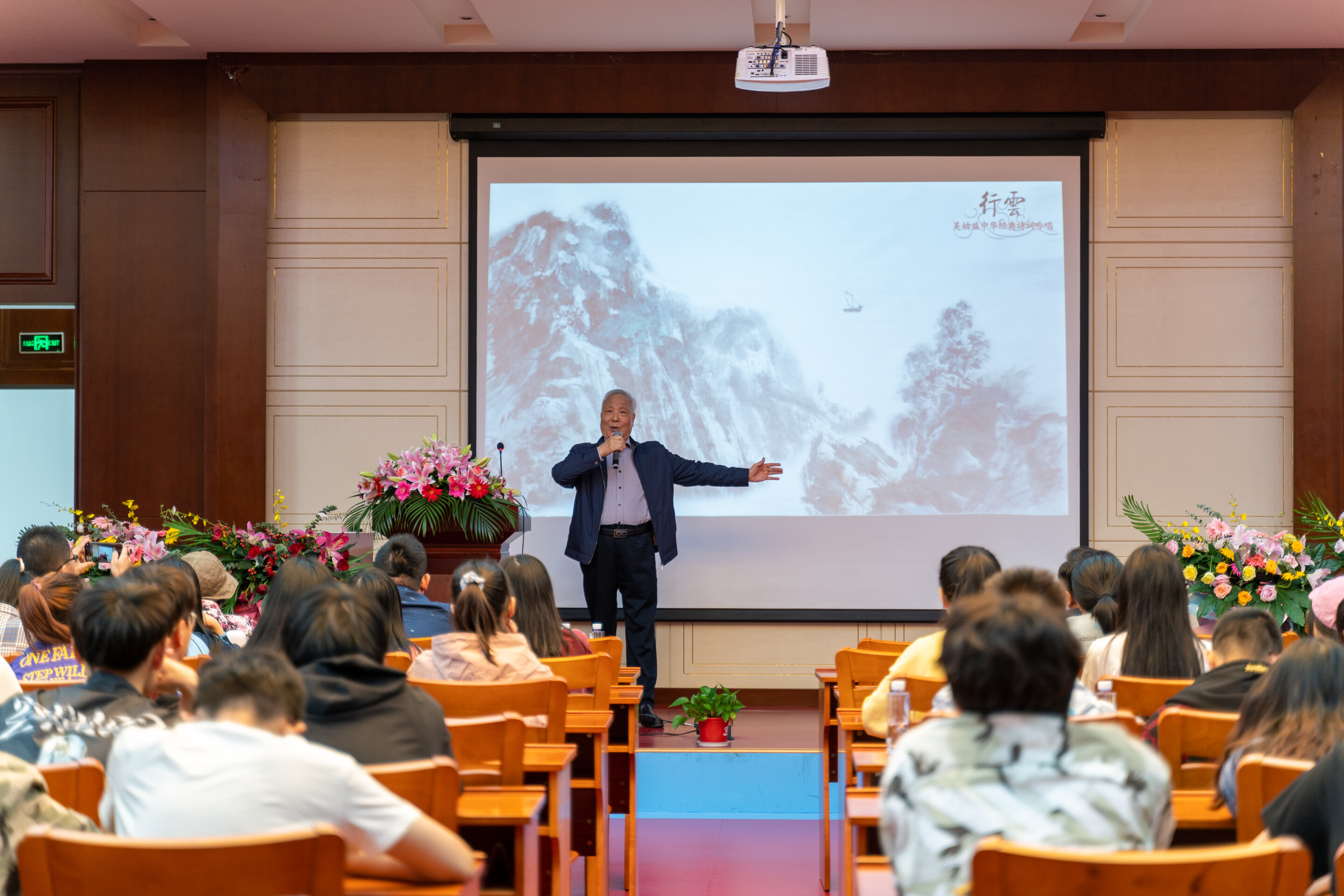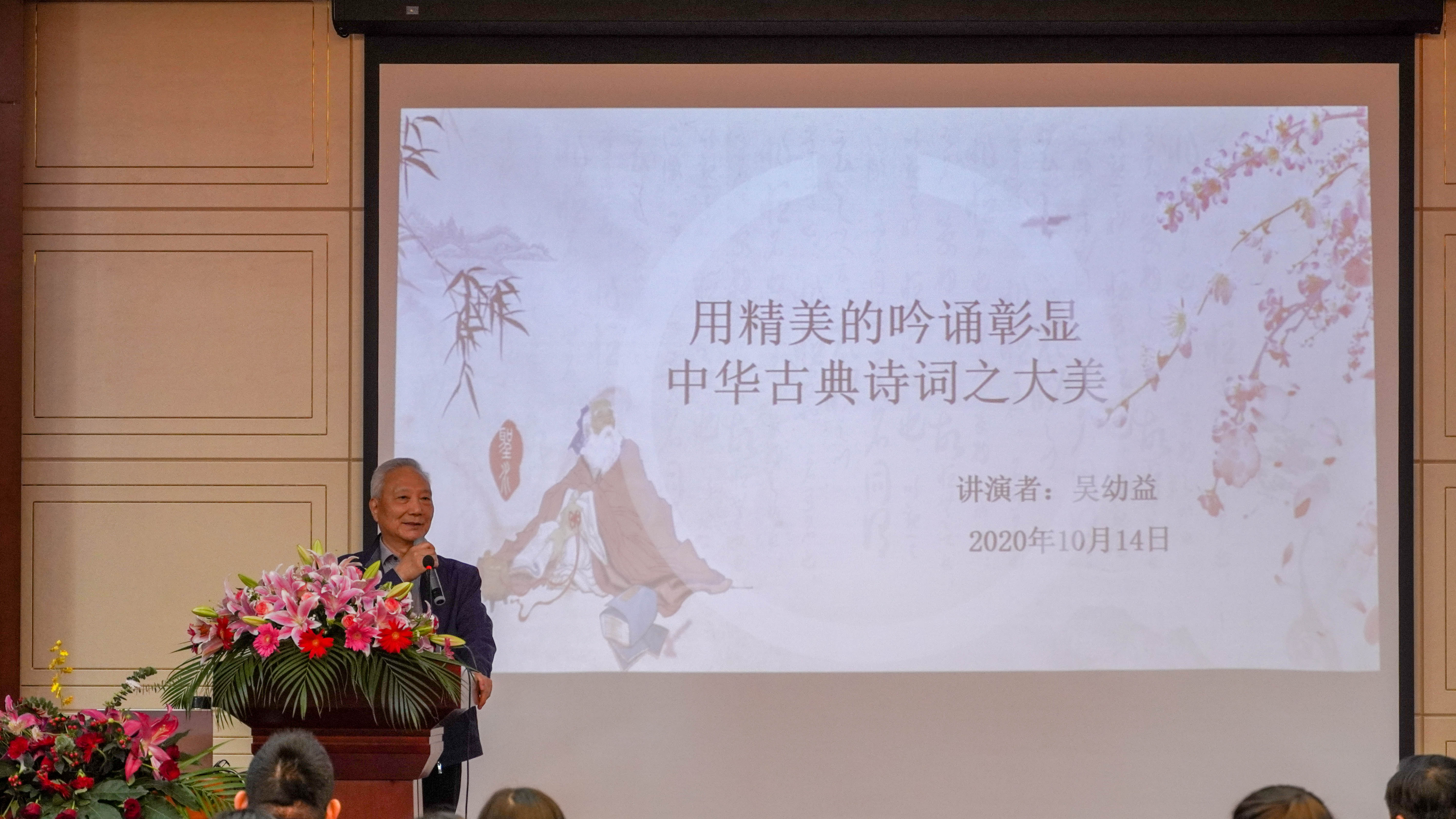 吴幼益用他时而高亢、时而低沉,时而洪亮,时而轻微的吟诵将一首首中华经典诗词娓娓道来,让人回味无穷。《大江歌罢掉头东》、《登幽州台歌》、《静夜思》、《黄鹤楼送孟浩然之广陵》、《短歌行》......一首首经典之作,无不表现的淋漓精致,将文学与音乐有机融为一体,形成我即诗,诗即我的最高境界。每首终了,师生们报以热烈的掌声。本次讲座是南通理工学院2020年校园文化艺术节系列活动之一,是以习近平新时代中国特色社会主义思想为指导,全面贯彻党的教育方针,坚持根植中华优秀传统文化深厚土壤,落实立德树人根本任务,把学生培养成德智体美劳全面发展的社会主义建设者和接班人的重要载体。