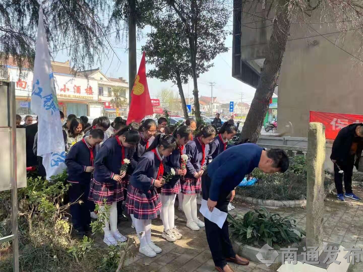 26日,如皋市长江镇义圩社区组织60多名党员干部、退役军人及在校学生,来到郭斌烈士墓前,祭扫革命先烈,学习红色精神。