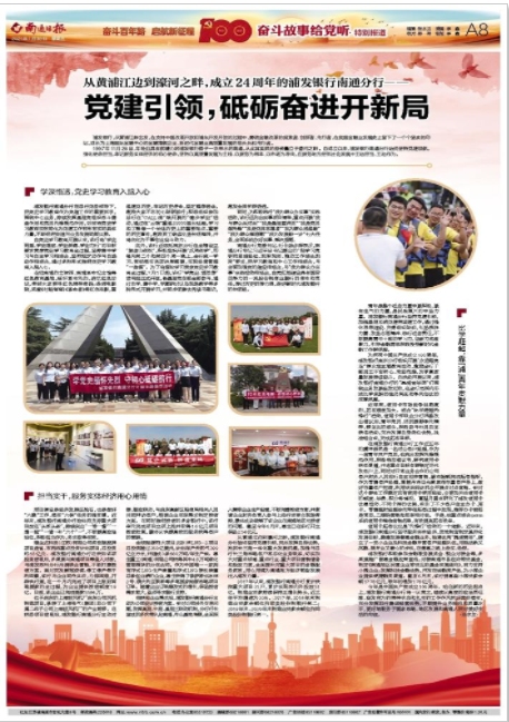 今年是中国共产党成立100周年。站在新的历史起点上,浦发银行南通分行将一以贯之,继续以高度的政治责任感、奋发有为的精神状态和扎实的工作作风抓好贯彻落实,充分发挥总行集团经营优势,不断提升业务能级和质量水平,更好地服务于国家战略、地区发展和南通人民对美好生活的向往。