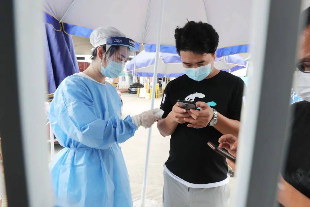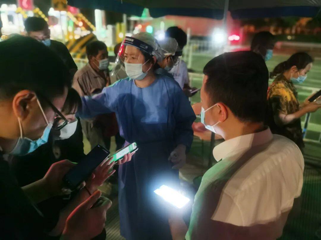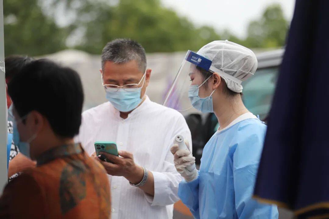 “您好,请配合测量体温,并且出示下行程码、苏康码,谢谢!”11日上午,港闸全科医学中心主任丁霞对着在排队等着核查的人员说,这个时候她已经值守了一夜的班,满眼的红血丝,因长时间的疲惫劳累,面容也有些苍白。核查结束完排队的群众,刚想喝点水,又有来通人员来登记信息,又是询问,测量,登记,待忙完一圈回到临时搭建的帐篷中,准备和下一轮来岗的志愿者交班时,她的脸就已晒得通红。