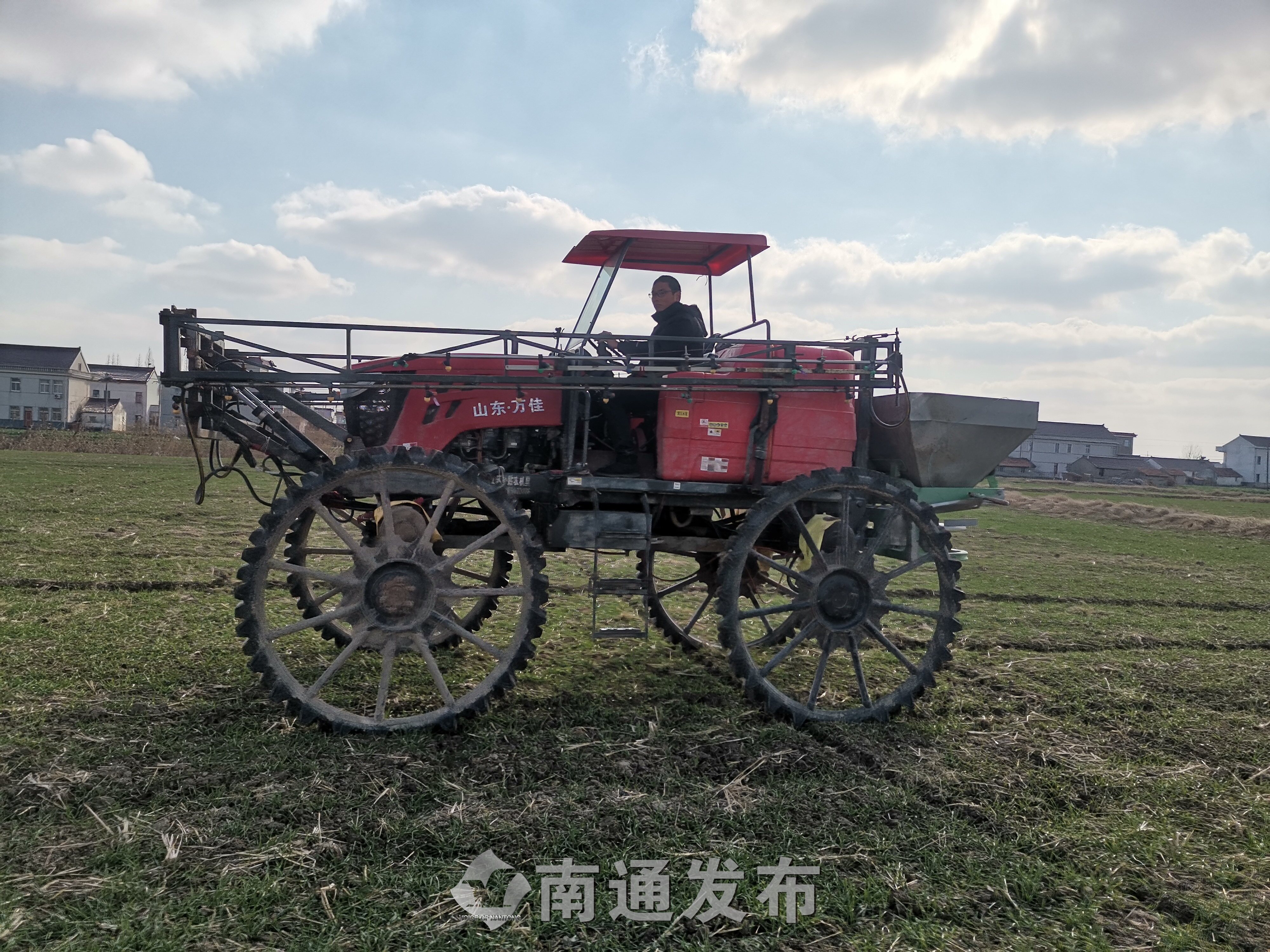 “过两天要下雨了,这几天湿度刚刚好,是施肥的最佳时机。”90后小伙子赵阳杭,熟练地驾驶着四轮植保机,在承包的108亩麦田里给小麦播撒肥料。