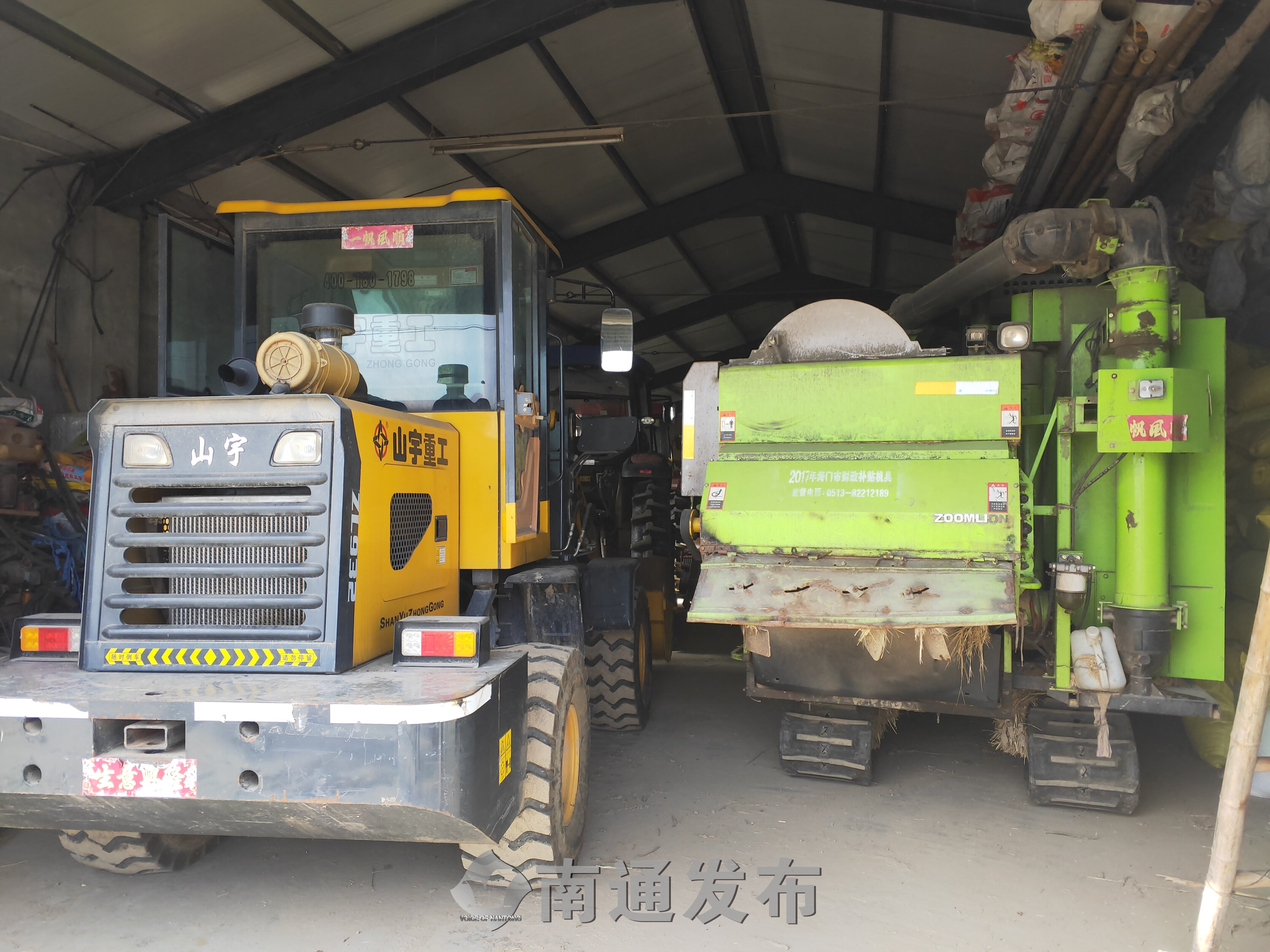 “我们种田,一般都有犁、耕、种、管、收五道程序,每一道都有专门的农具车进行操作。譬如,这个植保机和无人机,是用来撒肥、打药水的;大拖拉机是用来耕地、播种的;收割机、铲车是稻谷成熟时收割用的......”对于这些“庞然大物”,赵阳杭如数家珍。
