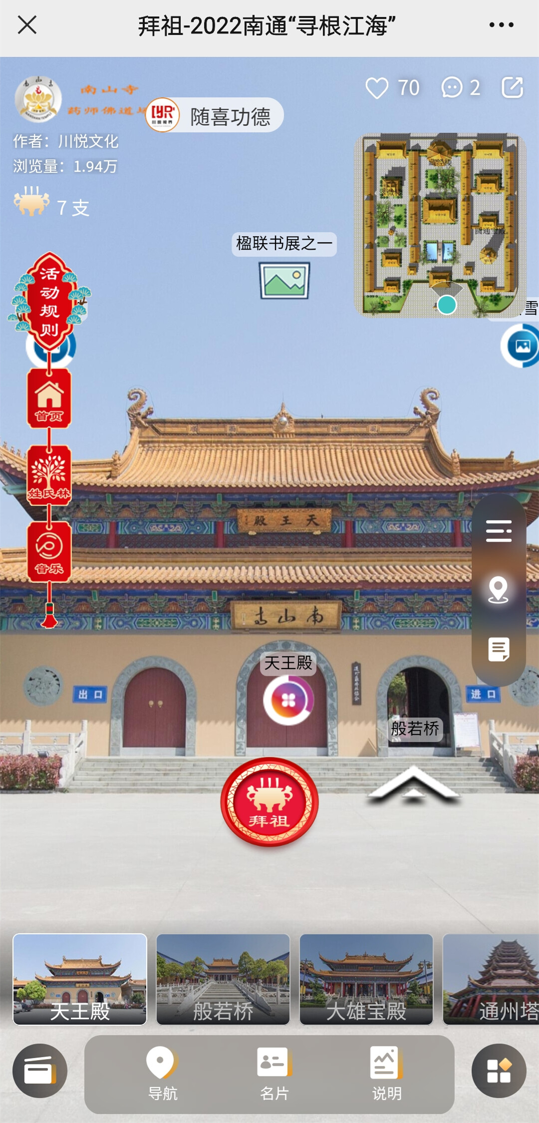VR全景体验式拜祖是今年平台最大的亮点,用户不论在全世界的哪个地方,只要登录平台进入该模块,即可沉浸式体验南山寺实景拜祖,足不出户,即可游览天王殿、般若桥、大雄宝殿等全貌,仿佛身在南山寺中,更具代入感。用户每小时可领取一支拜祖香,集满50支即可参与抽奖。