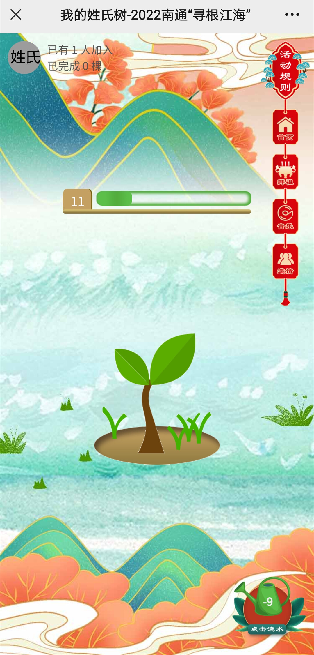 用户点击进入即可领取具有唯一编号的“虚拟姓氏树苗”,通过在平台上参与互动、浏览信息、分享转发等操作积攒“南山湖水滴”,用来浇灌和养育树苗,还可以邀请好友帮自己浇水助力,从而组成姓氏祈福林。50滴黄河水可以养成一棵姓氏树,50棵姓氏树组成姓氏祈福林。