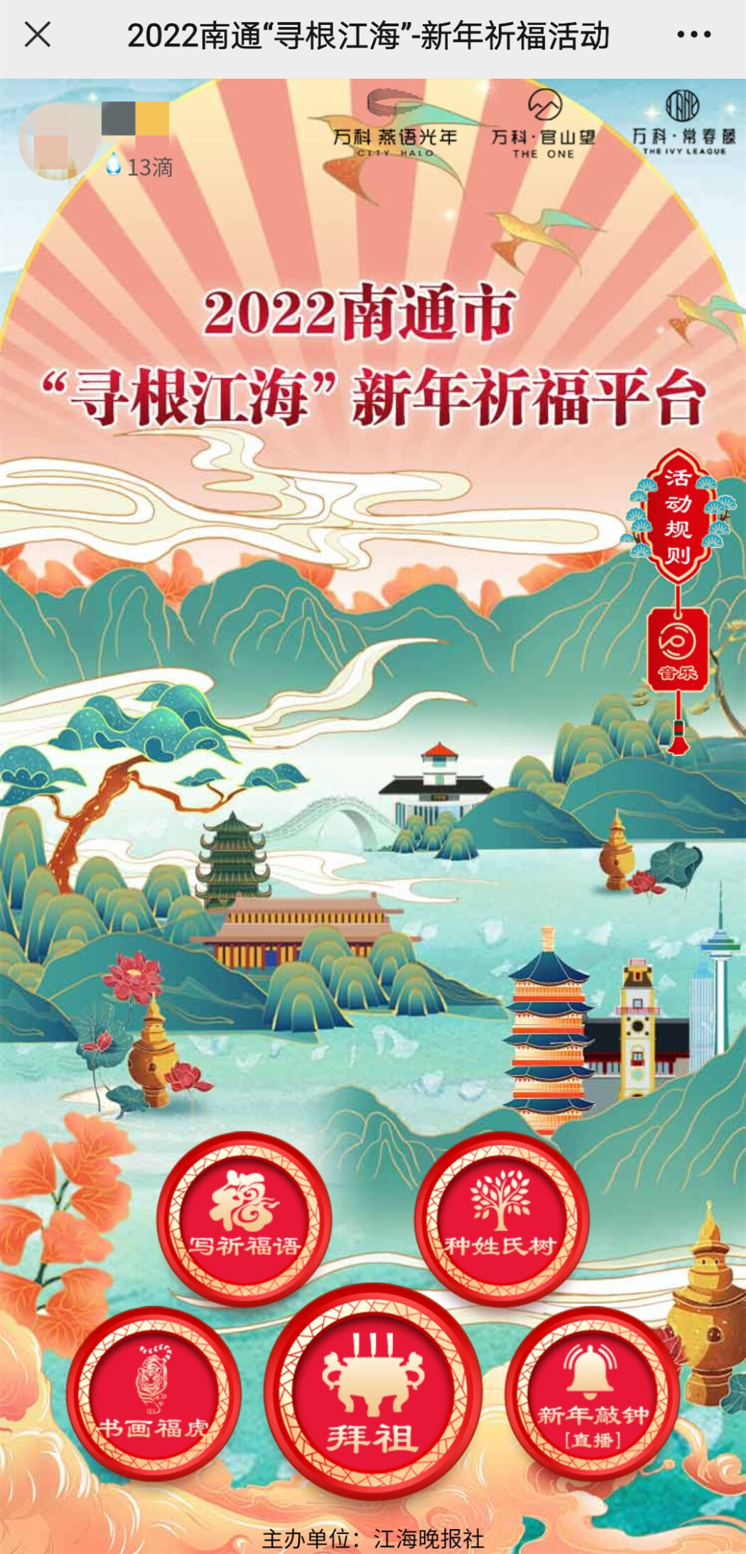 除夕,是中华民族最具特殊意义的传统佳节,是除旧布新、阖家团圆、祭祀祖先的日子。疫情当下,为了让更多江海儿女传承民俗文化、以解思乡之苦,南通报业传媒集团主办并打造2022“寻根江海”网上祈福平台。人们惊喜地看到:2022新年祈福玩出“新花样”——