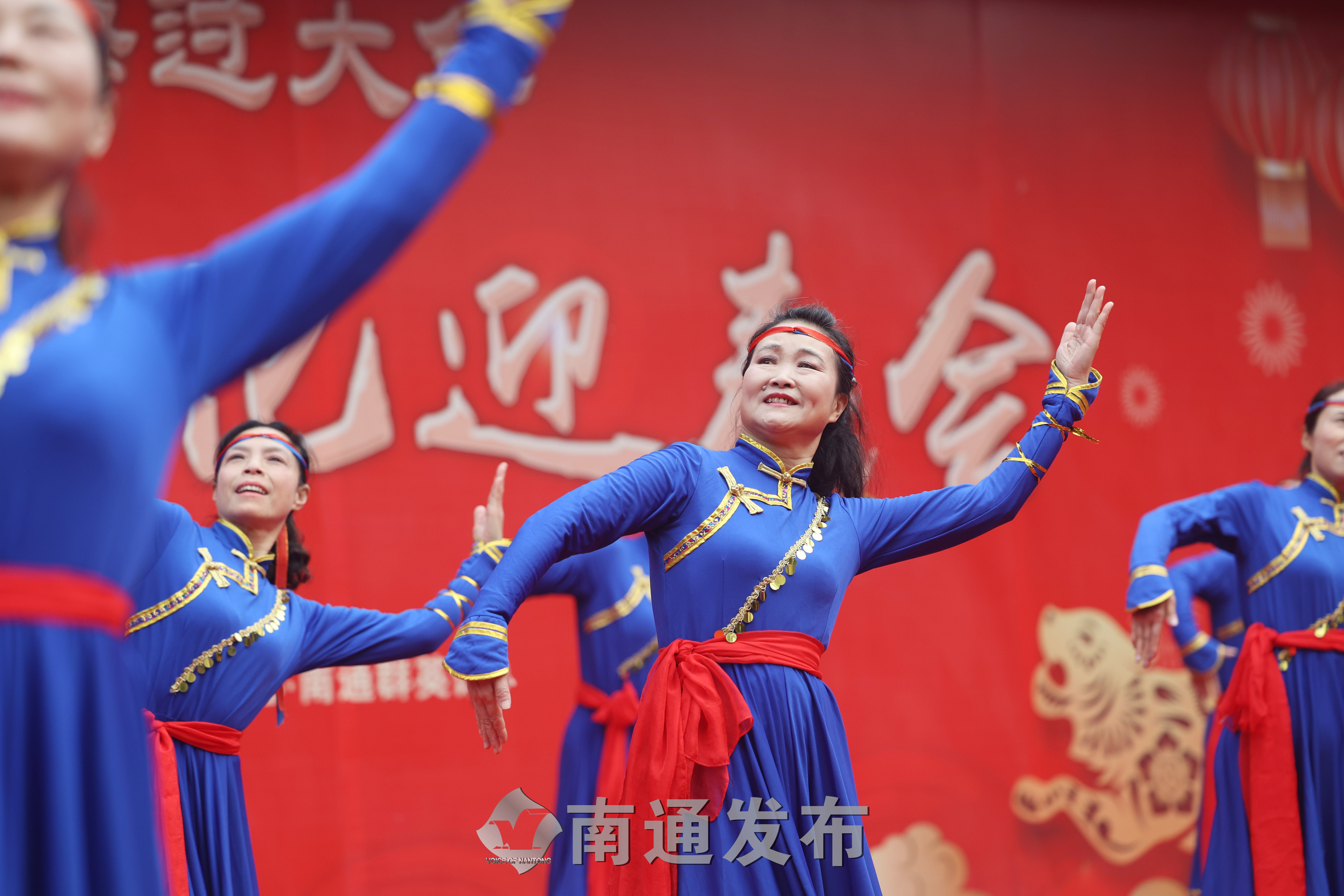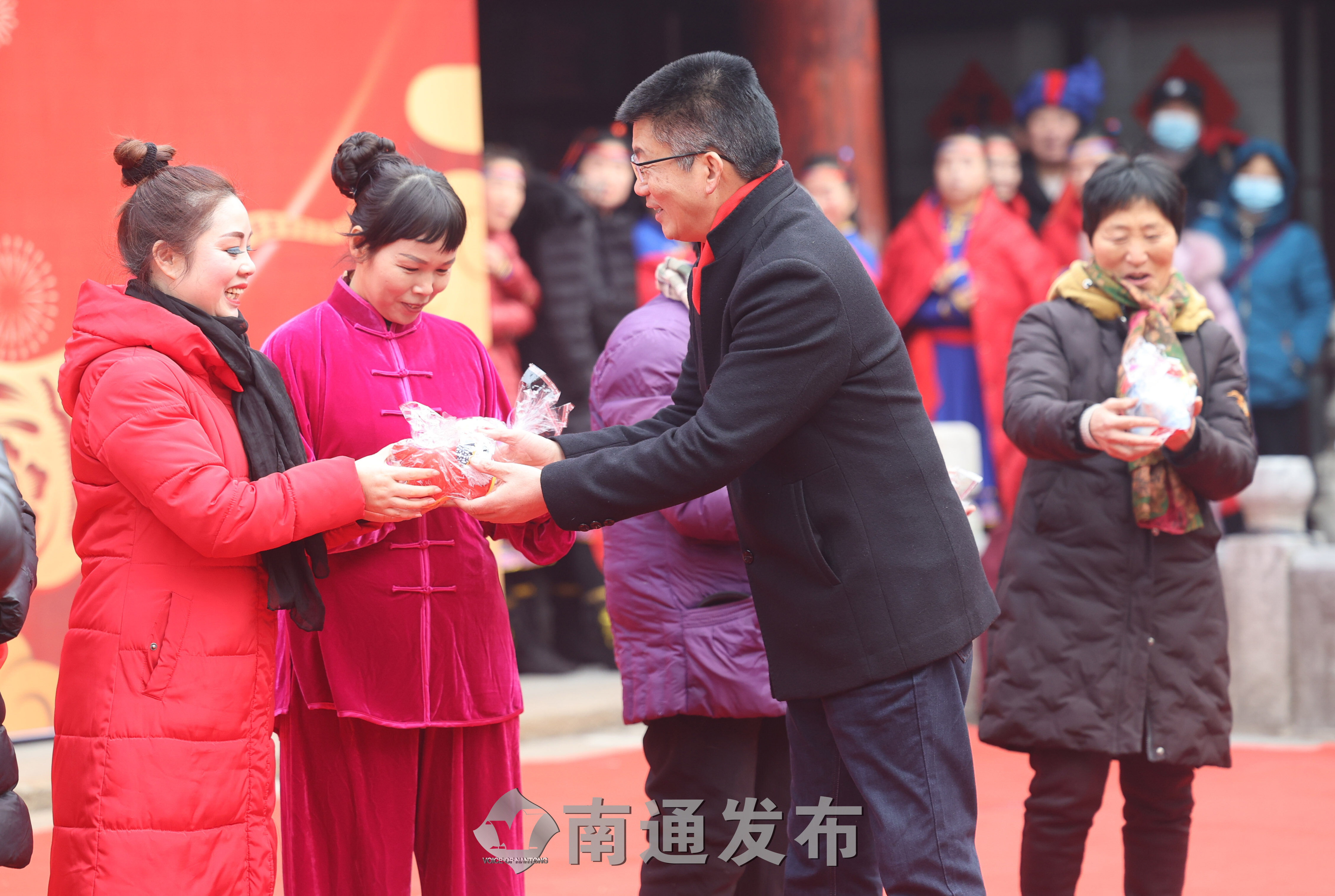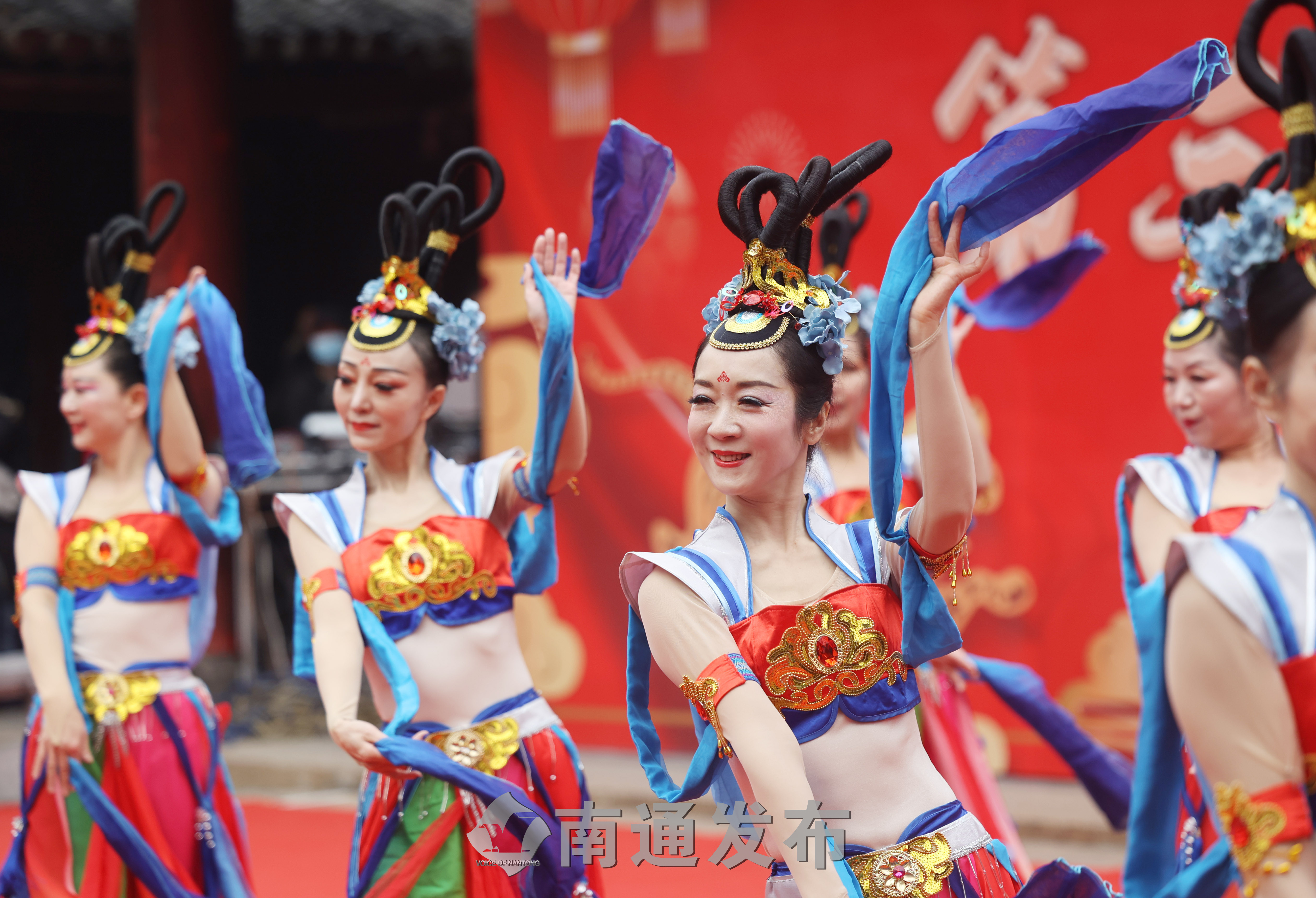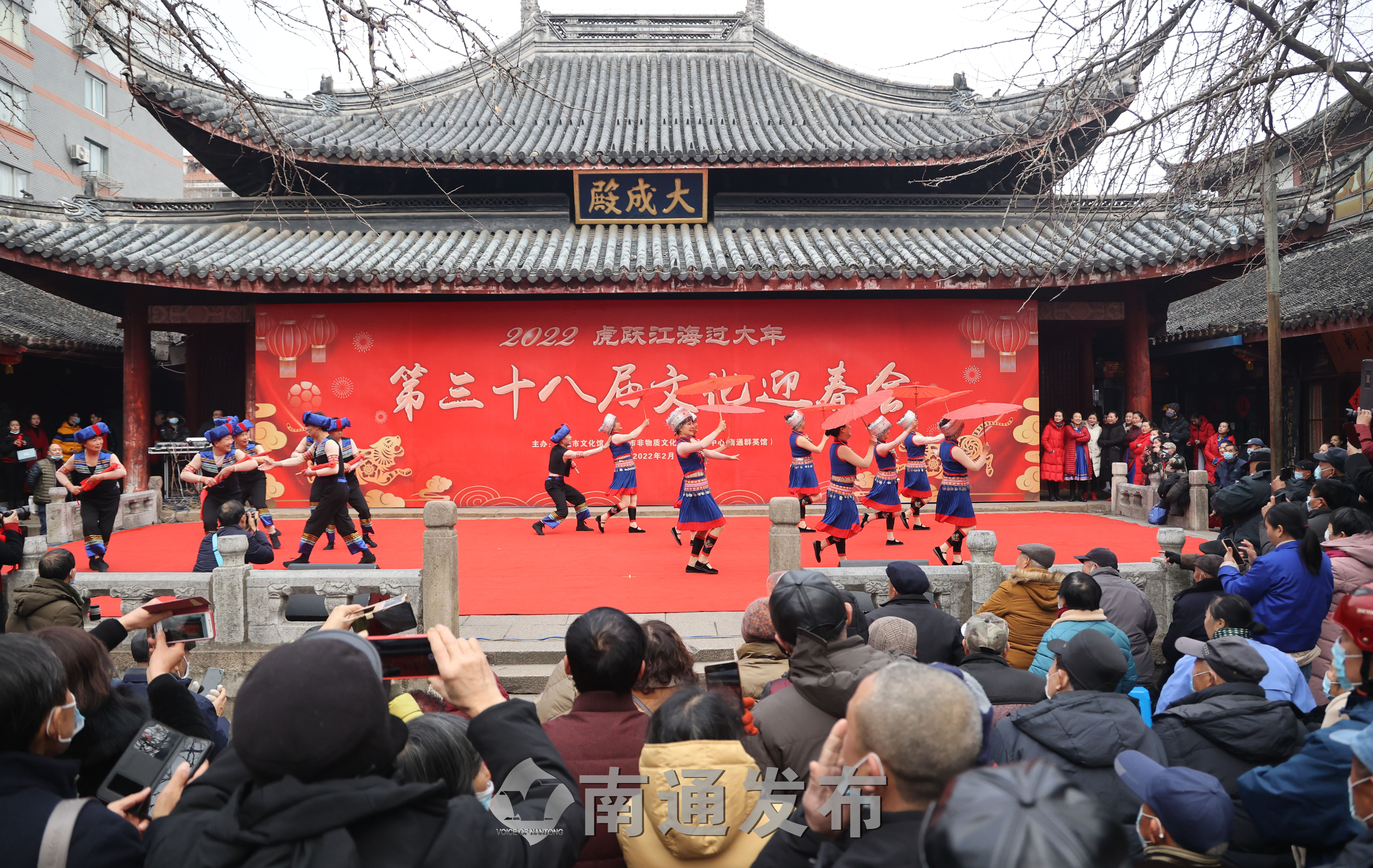 2月1日上午,第38届“文化迎春会”开幕式暨专场文艺演出在南通市文化馆大成殿广场举行,演员们载歌载舞庆祝新春佳节。