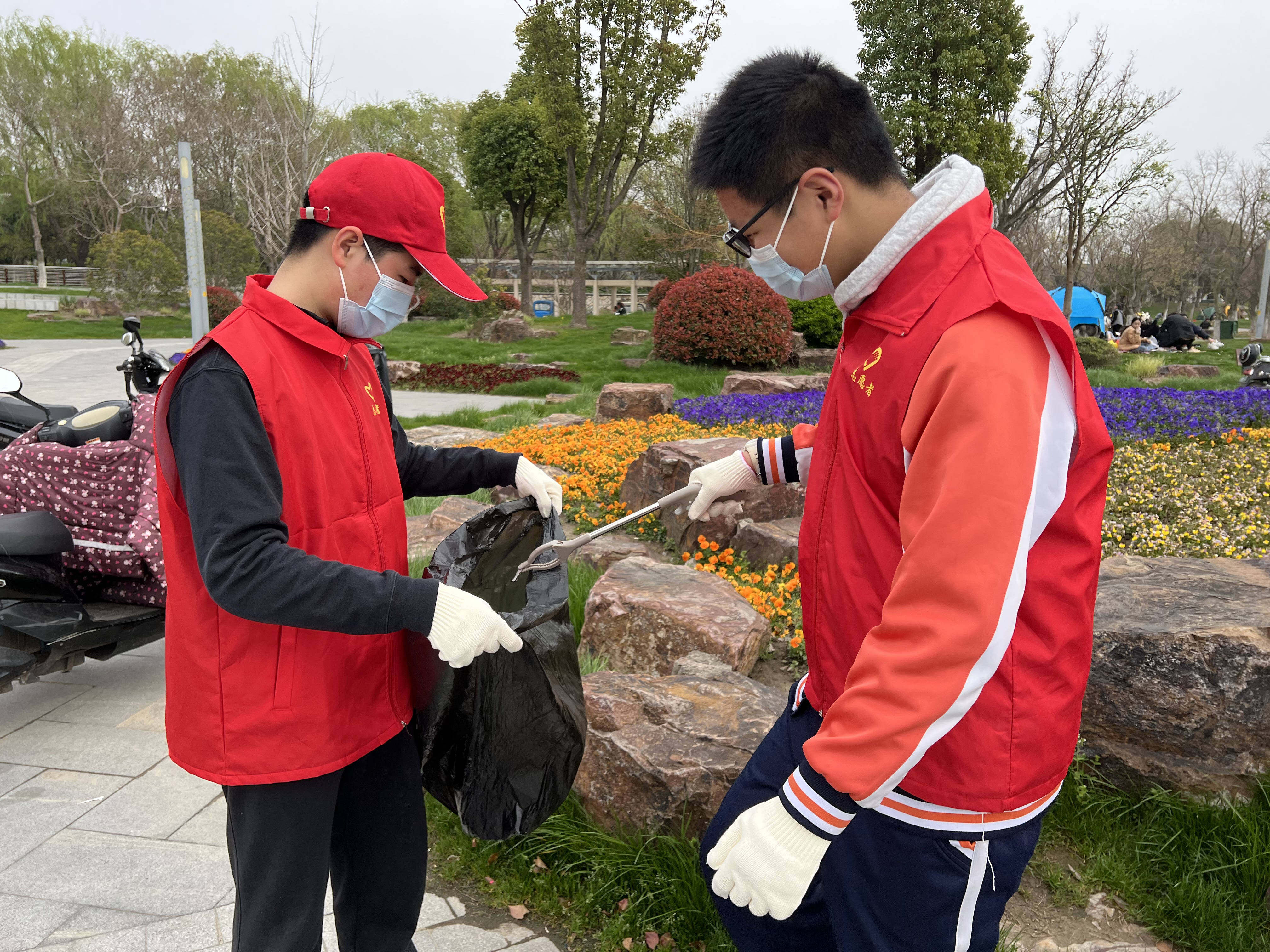 活动现场,志愿者们身着红马甲,手持夹钳,沿着滨江公园主干道一路捡拾沿途的矿泉水瓶、塑料袋、烟头等各种生活垃圾,还给大自然更和谐的美景。