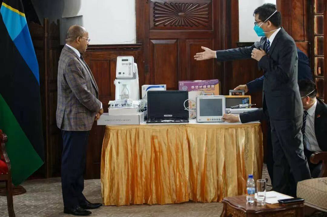 中国医疗队队长瞿利帅向坦桑尼亚桑给巴尔总统介绍捐赠的医疗药械的情况。