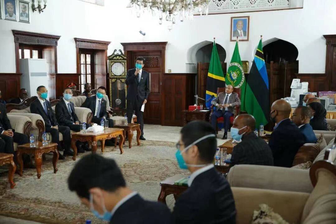 中国医疗队队长瞿利帅向坦桑尼亚桑给巴尔总统介绍中国医疗队队员相关情况。