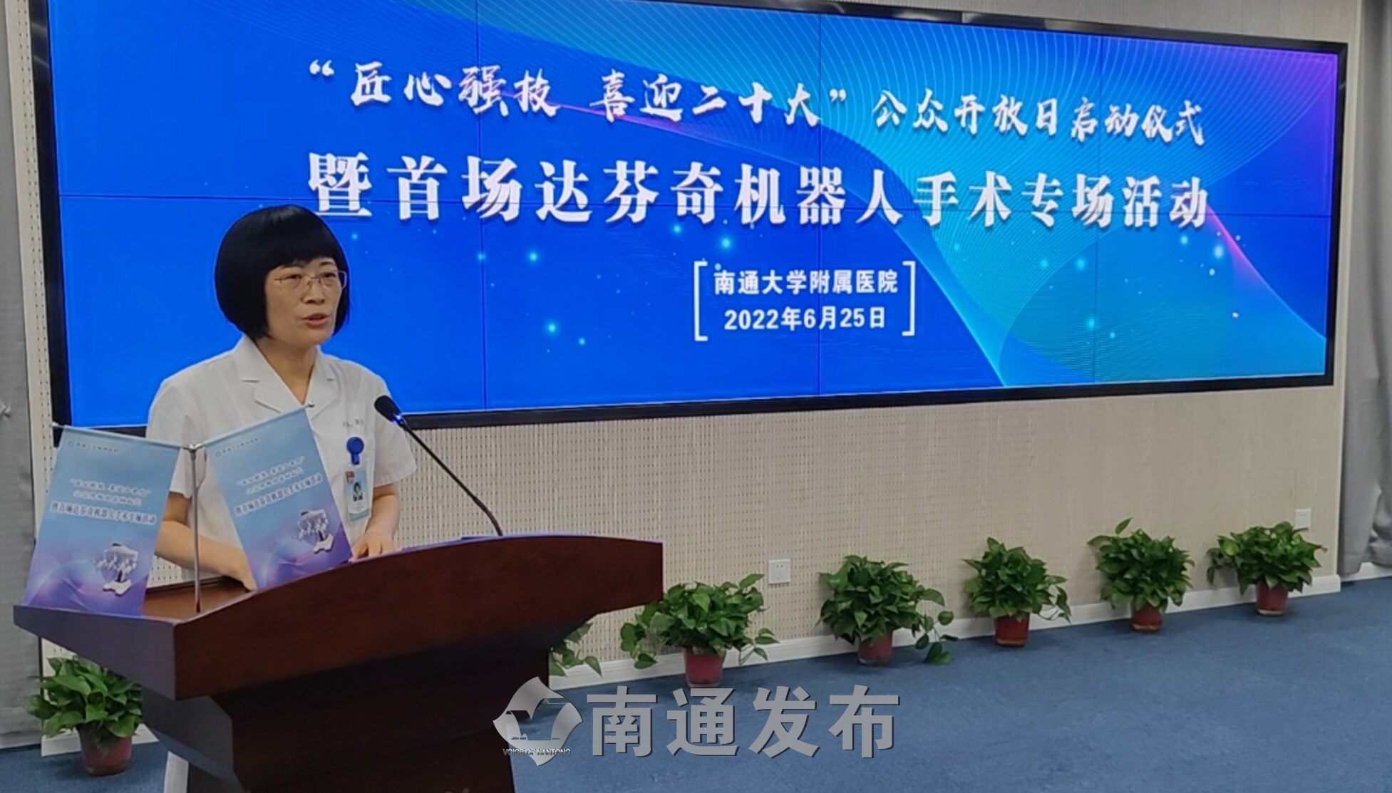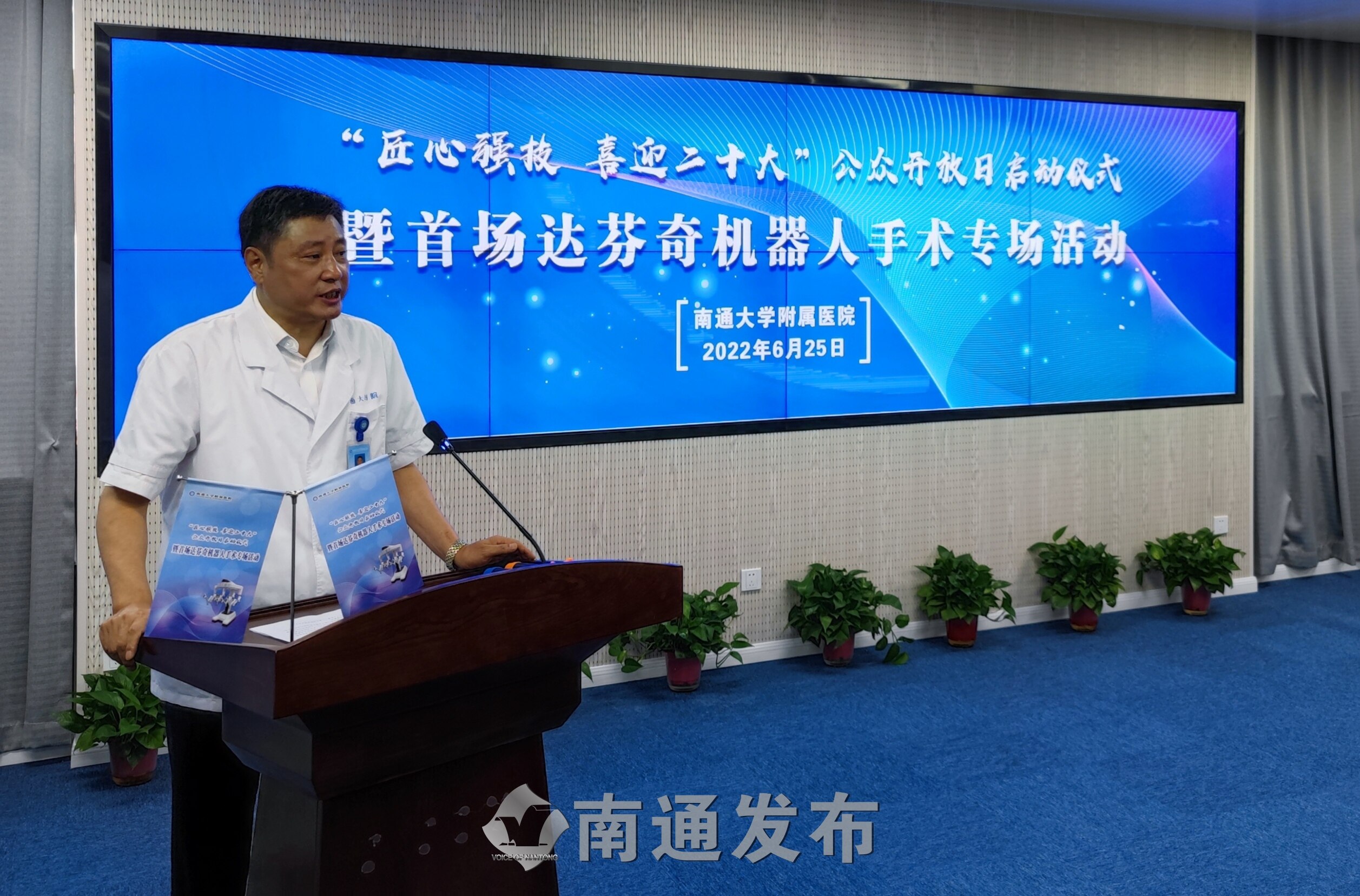6月25日,南通大学附属医院举办“匠心强技喜迎二十大”公众开放日启动仪式暨首场达芬奇机器人手术专场活动。通过手术室实地探访、达芬奇手术机器人实景演示和相关手术开展科室专家访谈,全面展示机器人手术的过程与优势。通大附院党委常务副书记马卫东,南通市委网信办副主任、三级调研员成继唐,通大附院副院长赵建美等出席活动。该院党委宣传部、麻醉手术科、医学装备处、医务部、护理部、门诊部、信息中心、行风监督处等部门和科室负责人,以及国家、省、市级媒体记者及南通自媒体大咖约40多人参加了活动。