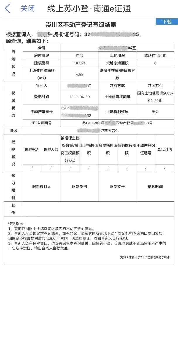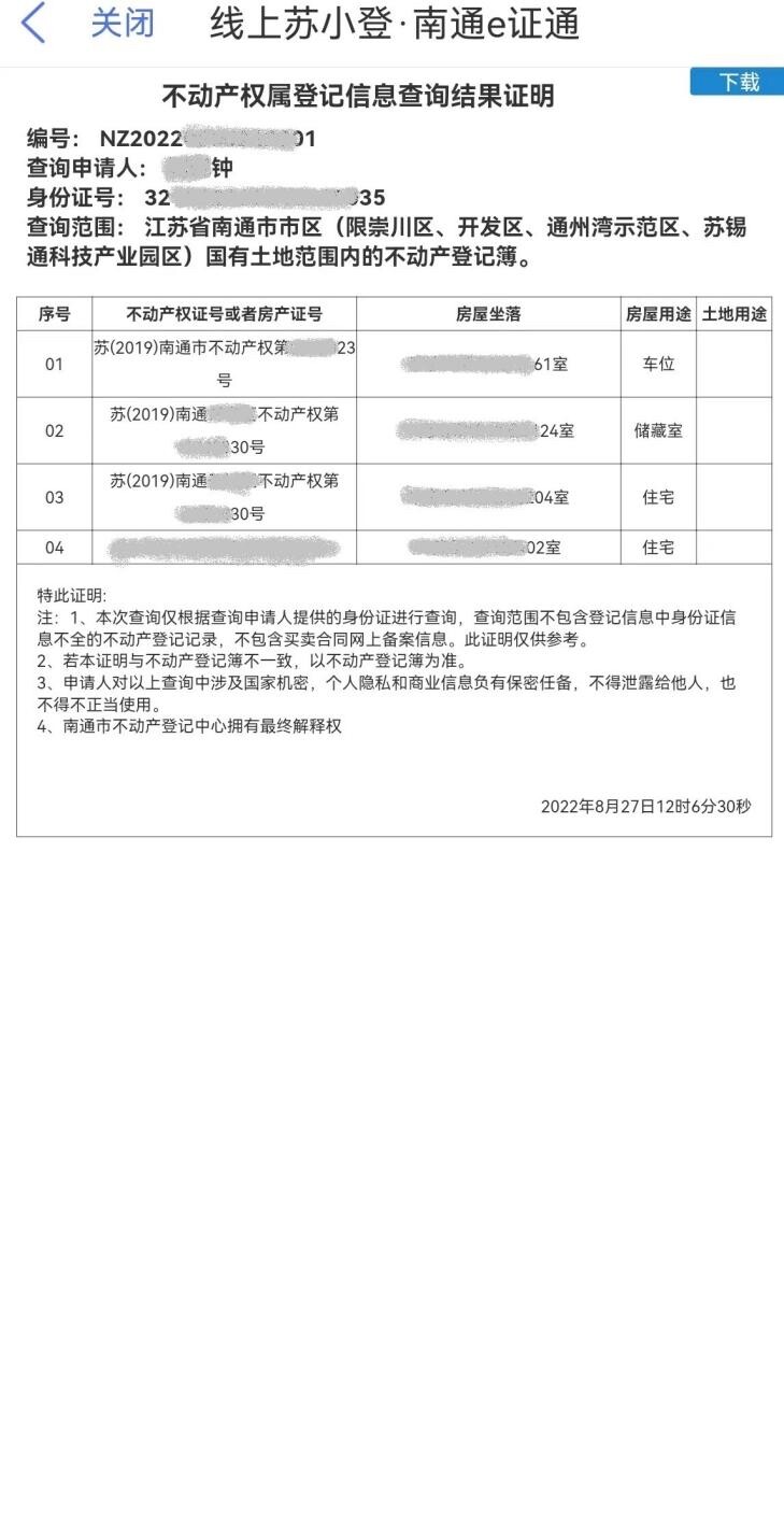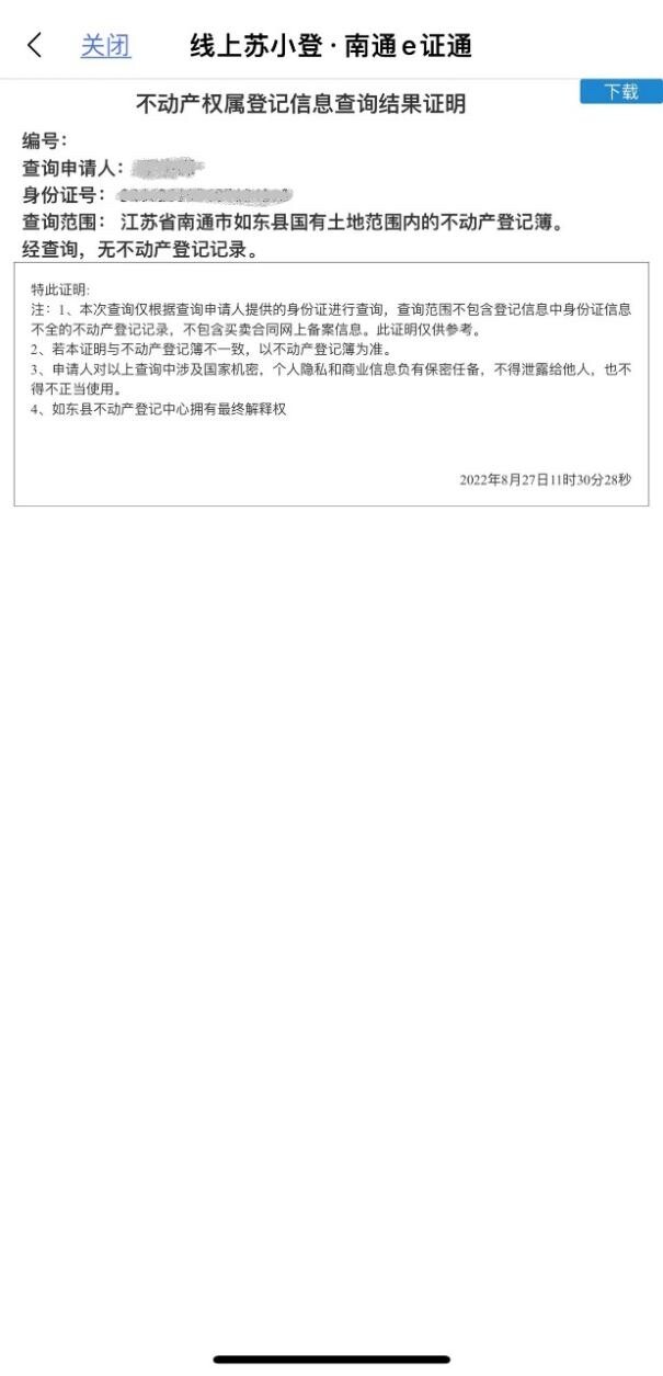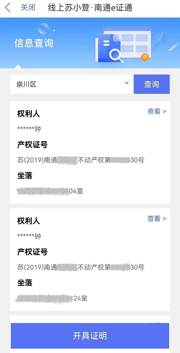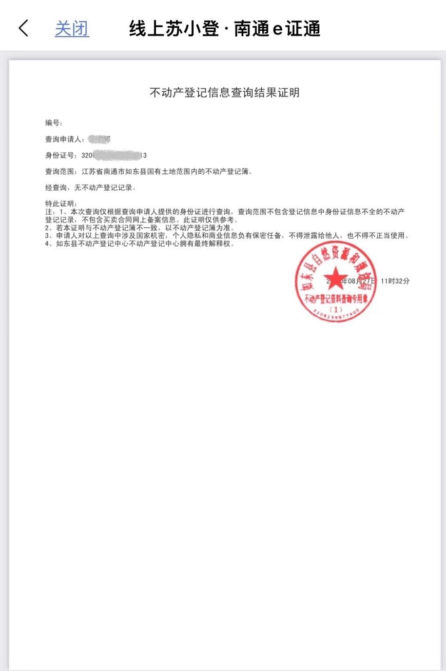 记者获悉,今后市民若要开具“无(有)房证明”和“不动产登记查询结果证明”,可以手机下载南通百通APP,点击“不动产登记”进入“线上苏小登·南通e证通”服务平台,随后点击“信息查询”,选择查询范围后即可查看名下不动产信息,点击“开具证明”即可看到“不动产权属登记信息查询结果证明”即“无(有)房证明”,再点击右上角“下载”,获取加盖公章的“无(有)房证明”;若信息查询下有不动产,点击对应不动产右上角的“查看”,即可看到该不动产登记详细信息,再点击右上角“下载”,获取加盖公章的“不动产登记查询结果证明”。这两项证明与各地不动产登记机构人工窗口、自助查询机出具的证明具有同等法律效力。