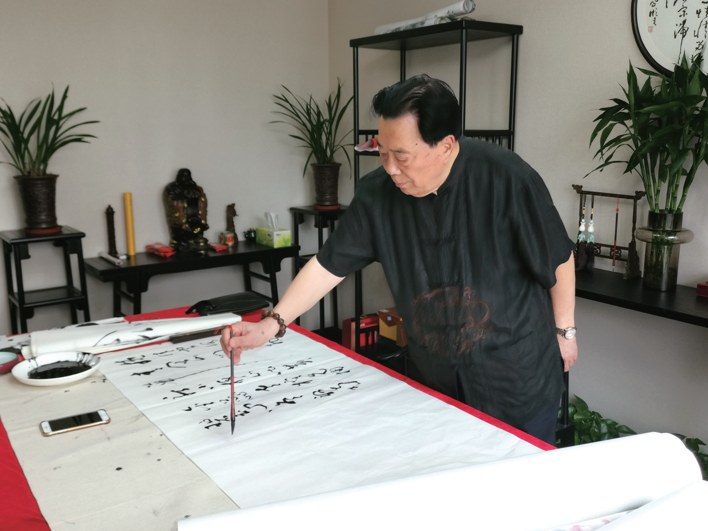 陆凤彬深有体会地表示,中国人写好方块字是责任,也是爱国的表现。可以从中学到许多课本上学习不到的东西,比如历史、政治、经济、文化等知识,还可以了解和学习到许多文人骚客、社会贤达、有识之士的风采故事,以及古风雅韵、齐家理政的诗词格言等等。书法是一项陶冶情操、修身养性的活动,他的身体好与写书法有着直接联系。