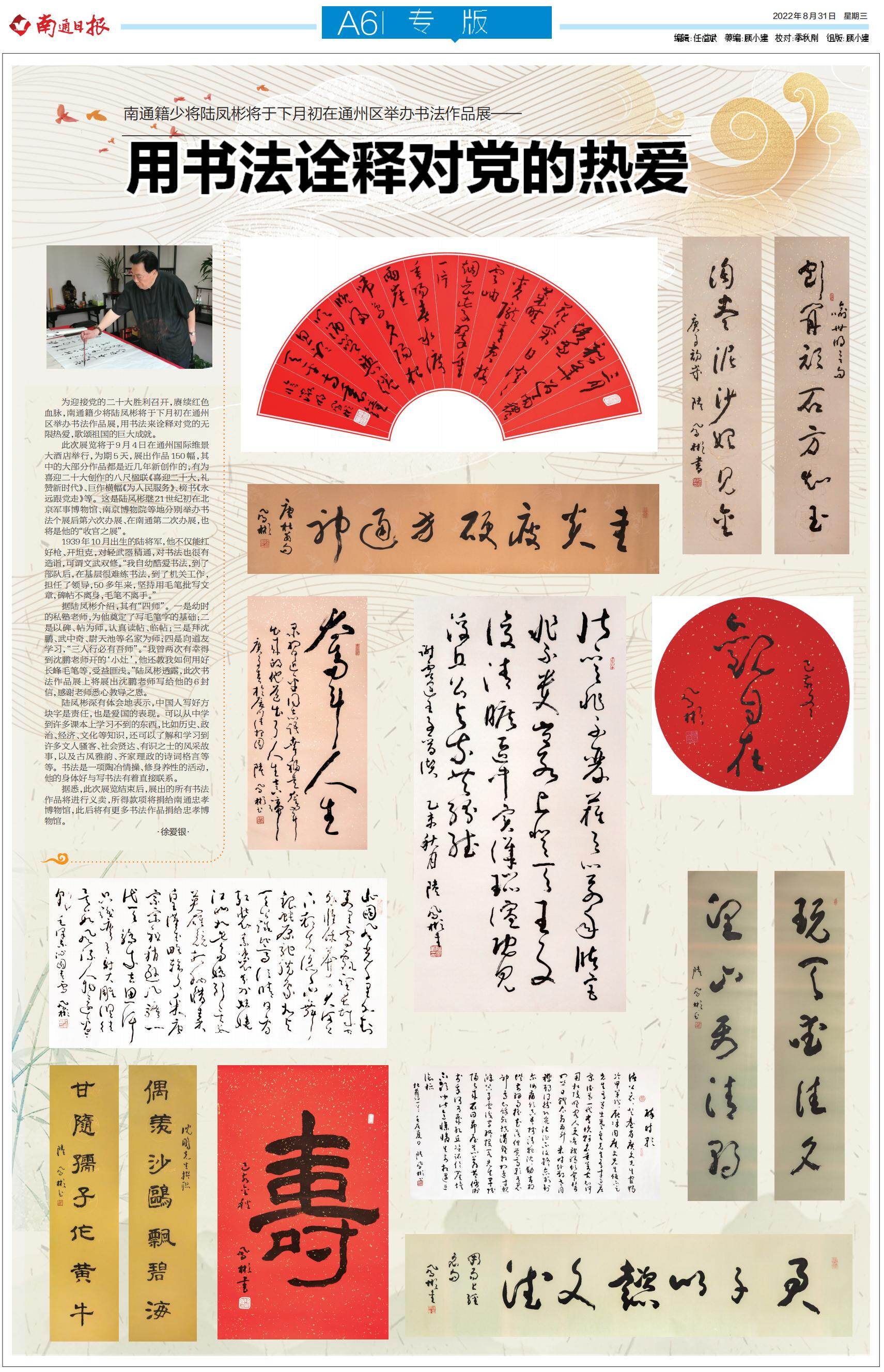 为迎接党的二十大胜利召开,赓续红色血脉,南通籍少将陆凤彬将于下月初在通州区举办书法作品展,用书法来诠释对党的无限热爱,歌颂祖国的巨大成就。