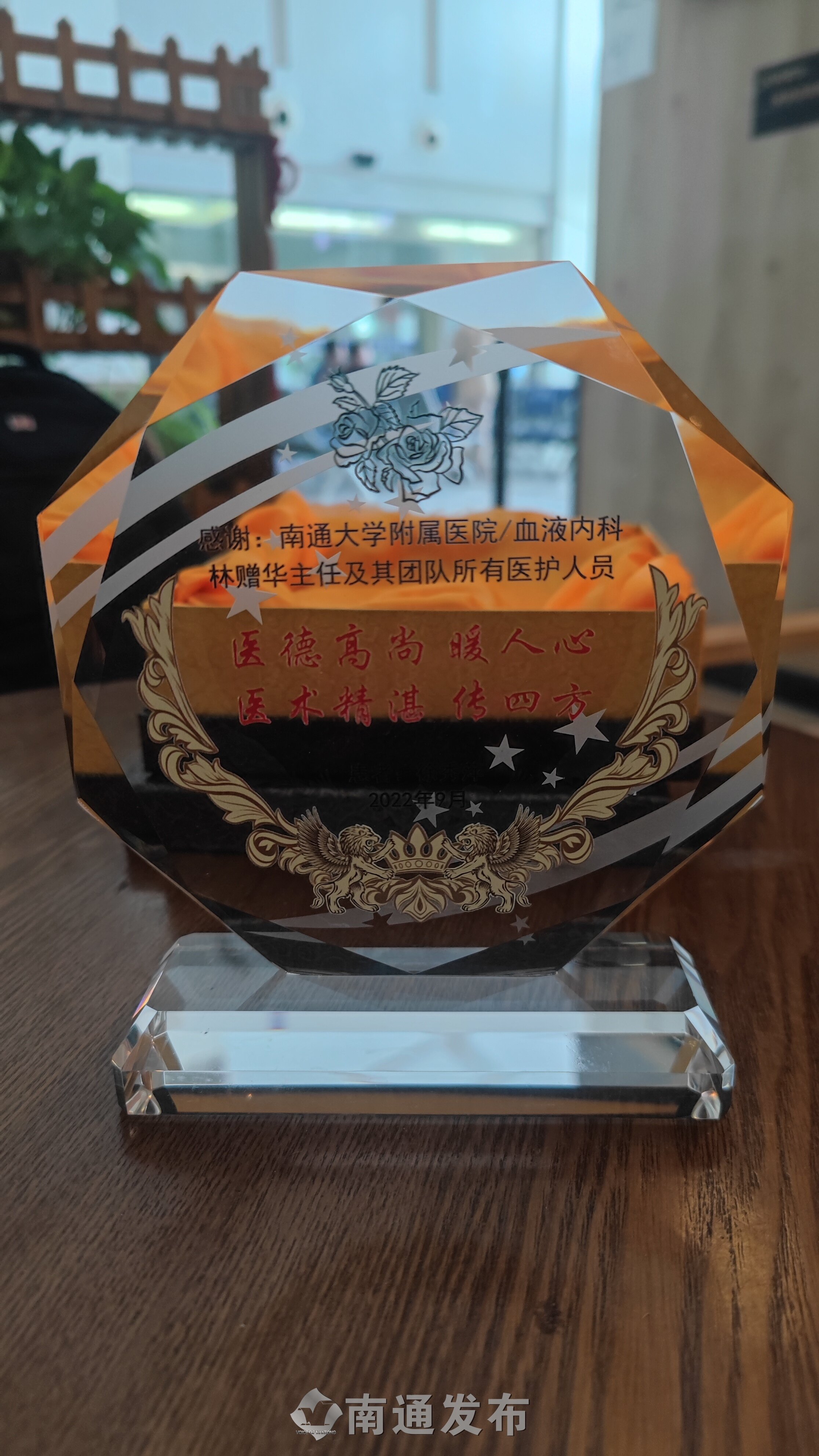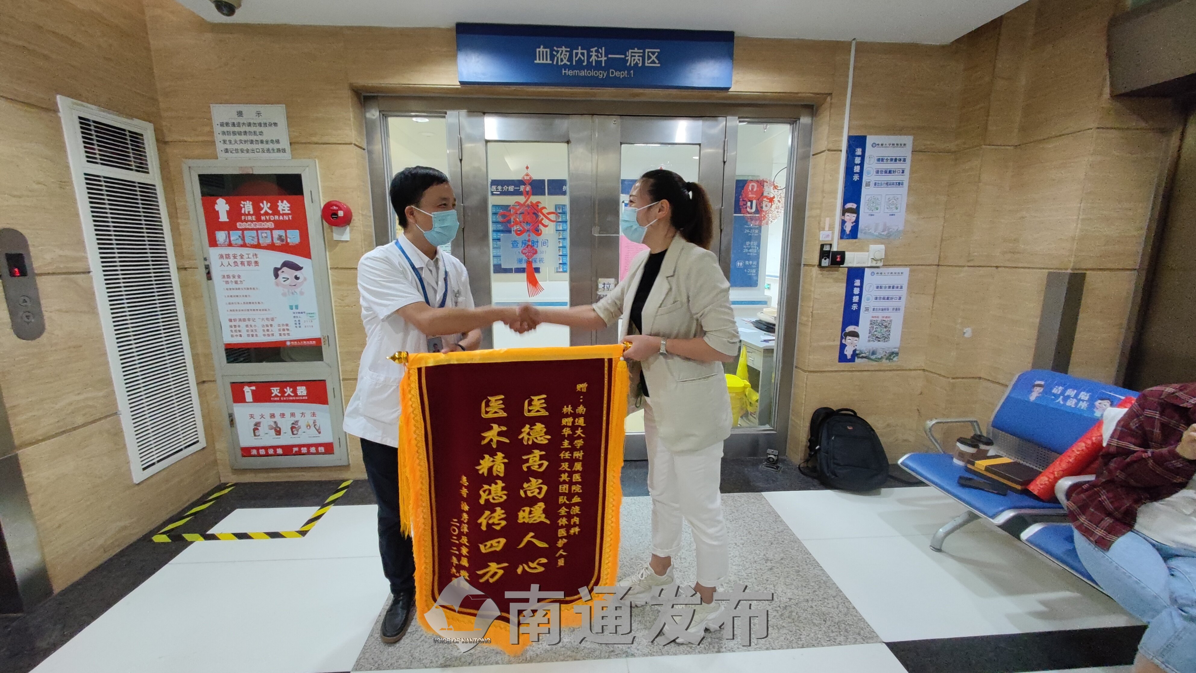“感谢通大附院血液科,感谢林赠华医生团队给我们家庭的帮助,让我们全家真切感受到了医者的仁心和温暖!”9月24日,来自如东县丰利镇的钱美宏女士,拿着一面写有“医德高尚暖人心 医术精湛传四方”字样的锦旗来到通大附院血液内科一病区门前,湿润的眼眶饱含感激之情,亲手将这面锦旗递到通大附院血液内科副主任医师林赠华手中。