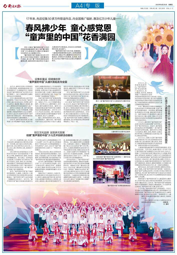 儿童事业要发展好离不开各级党委和政府、社会各方面支持。今年年初,南通市委办1号文件下发《“童声里的中国”品牌提升行动计划(2023-2025)》,明确了工作的总体目标和“精品打造、扩大传播、阵地建设、深化研究、拓展形式”五部分14个方面的重点任务,在市级层面加强对“童声里的中国”的组织领导和顶层设计,形成市区、部门联动机制,凝聚工作合力。计划印发以来,南通市委宣传部多次召开“童声里的中国”专题座谈会、推进会,确保思想精深、艺术精湛、制作精良的优秀作品层出不穷,进一步提升品牌效应。