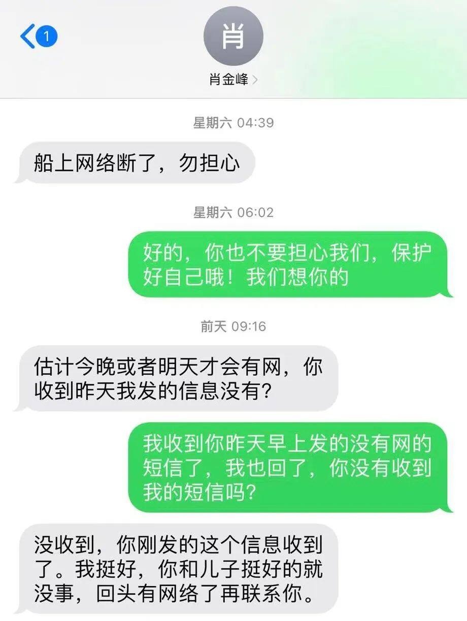“船上网络断了,勿担心。”北京时间11日凌晨4时39分,肖金峰给妻子黎小红发来了一条短信后,便暂时失联了。到12日上午9时许,肖金峰发来第二条短信:“昨天的短信收到了吗?我挺好的,估计今晚或者明天才会有网,回头再联系。”
