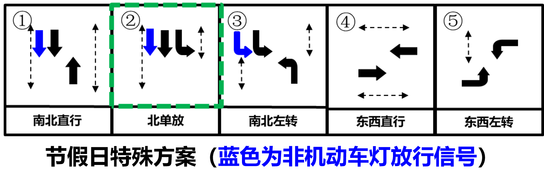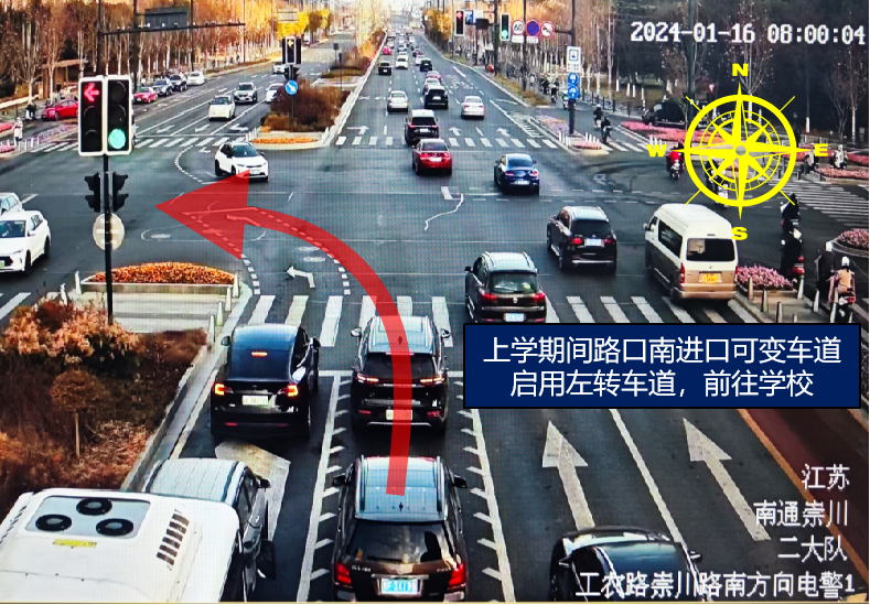 工农路崇川路路口,紧邻通师一附小学。上学期间,路口南面左转前往学校的车辆较多,因此路口南面的可变车道设置为左转车道。放假后,左转车流需求减少,因此将南面的可变车道改为直行车道,同时优化绿信比,即各个放行方向的绿灯时间分配,提高直行车辆通行效率。通师一附附近的崇川路崇学路路口,也调整了信号灯配时。放假后路口车流量明显减少,针对存在绿灯时间无车通过的空放现象,交警部门已重新设置红绿灯运行方案。