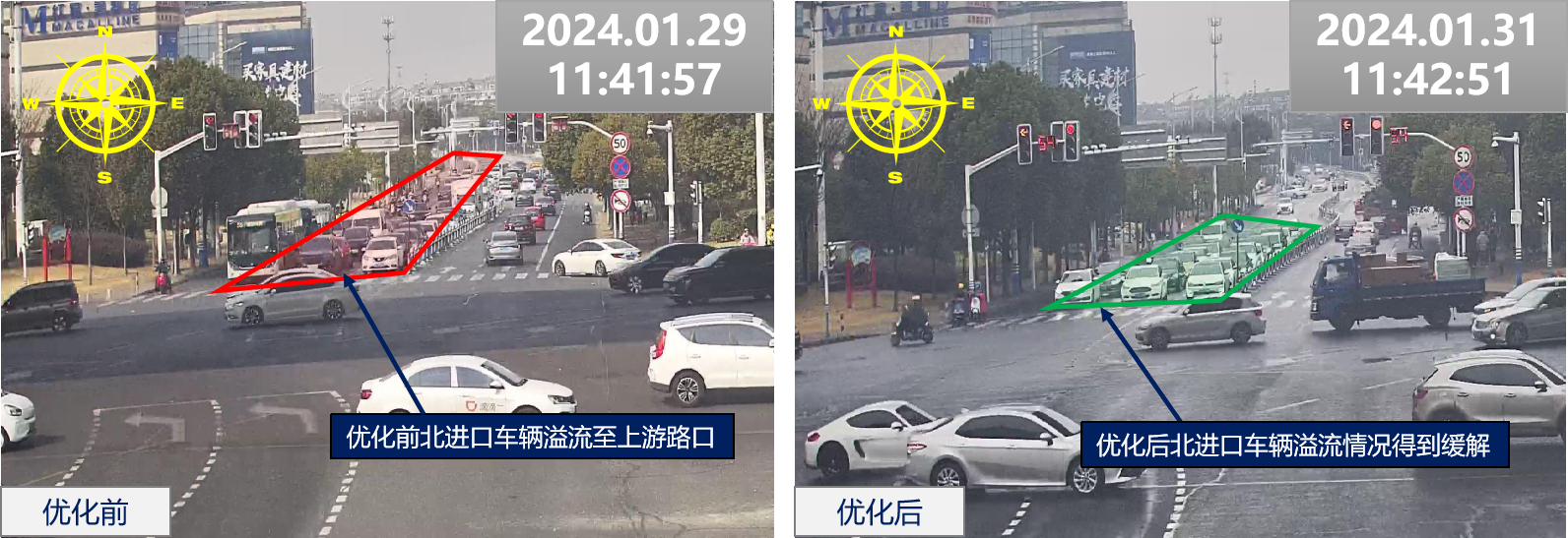 山姆会员商店附近的江海大道深南路路口,是快速路与地面道路衔接的关键集散转换节点,路口周边分布多个商业中心,工作日晚高峰片区通过性交通与商圈驶离集散交通汇集。春节临近,市民采购年货等购物需求激增,片区车流暴增,其中山姆会员商店虽设有4个停车场出入口,但驶离车辆大多汇聚至江海大道深南路路口北面,节点流量过载。于是,交警部门从1月30日起在路口南北直行绿灯后,增加了北面车辆直行和左转同时放行的绿灯,提升路口北面来车的通行能力。