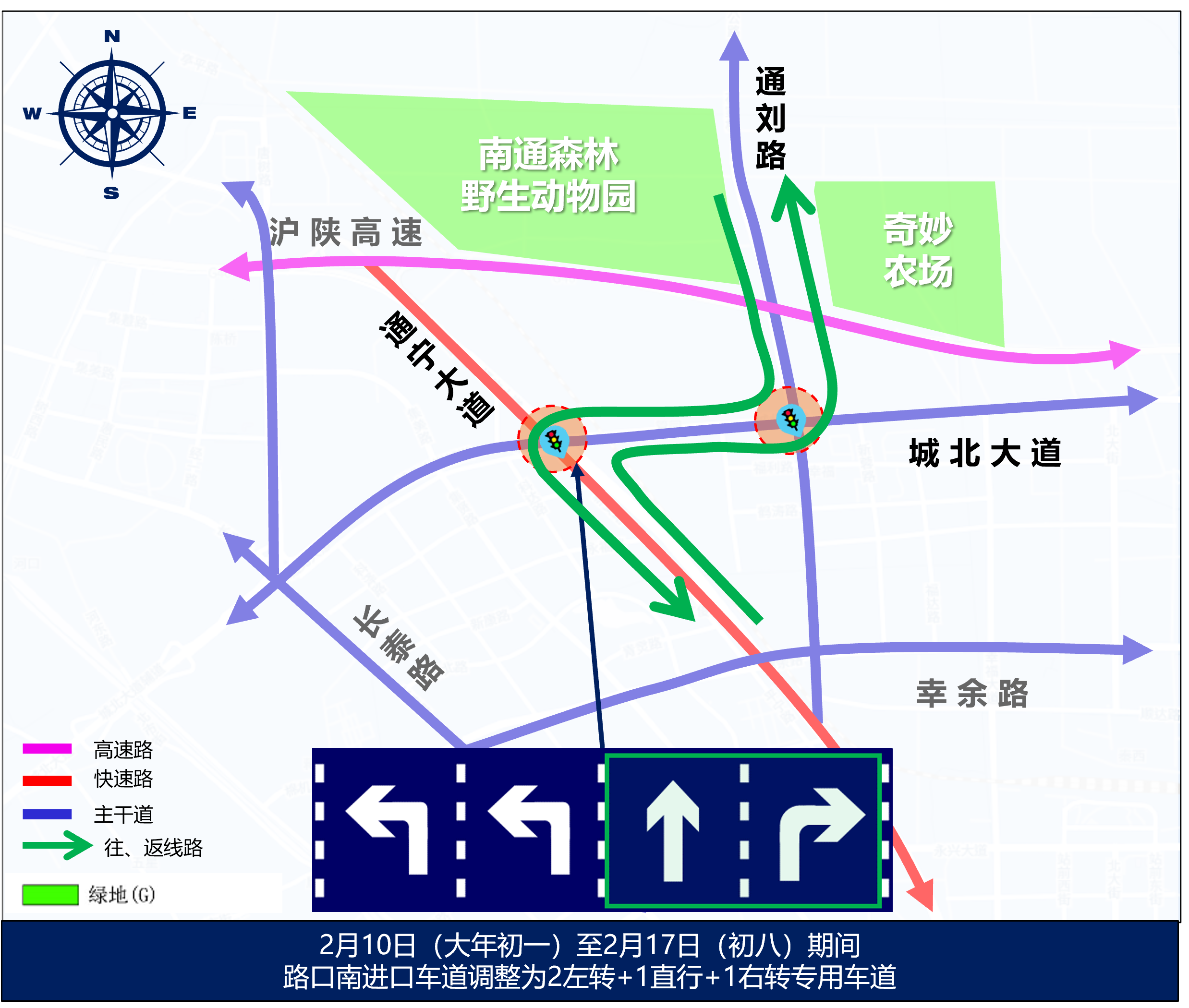 城北大道通宁大道路口作为市区前往野生动物园的主要节点路口,交警计划在2月10日(大年初一)至2月17日(初八)期间,将路口南进口车道由目前的3股左转、1股直右车道调整为2股左转、1股直行、1股右转车道,保障右转往动物园车流顺畅。同时,对城北大道通宁大道、城北大道通刘路等路口信号配时进行优化调整,重点增加动物园往返方向绿灯放行时间。