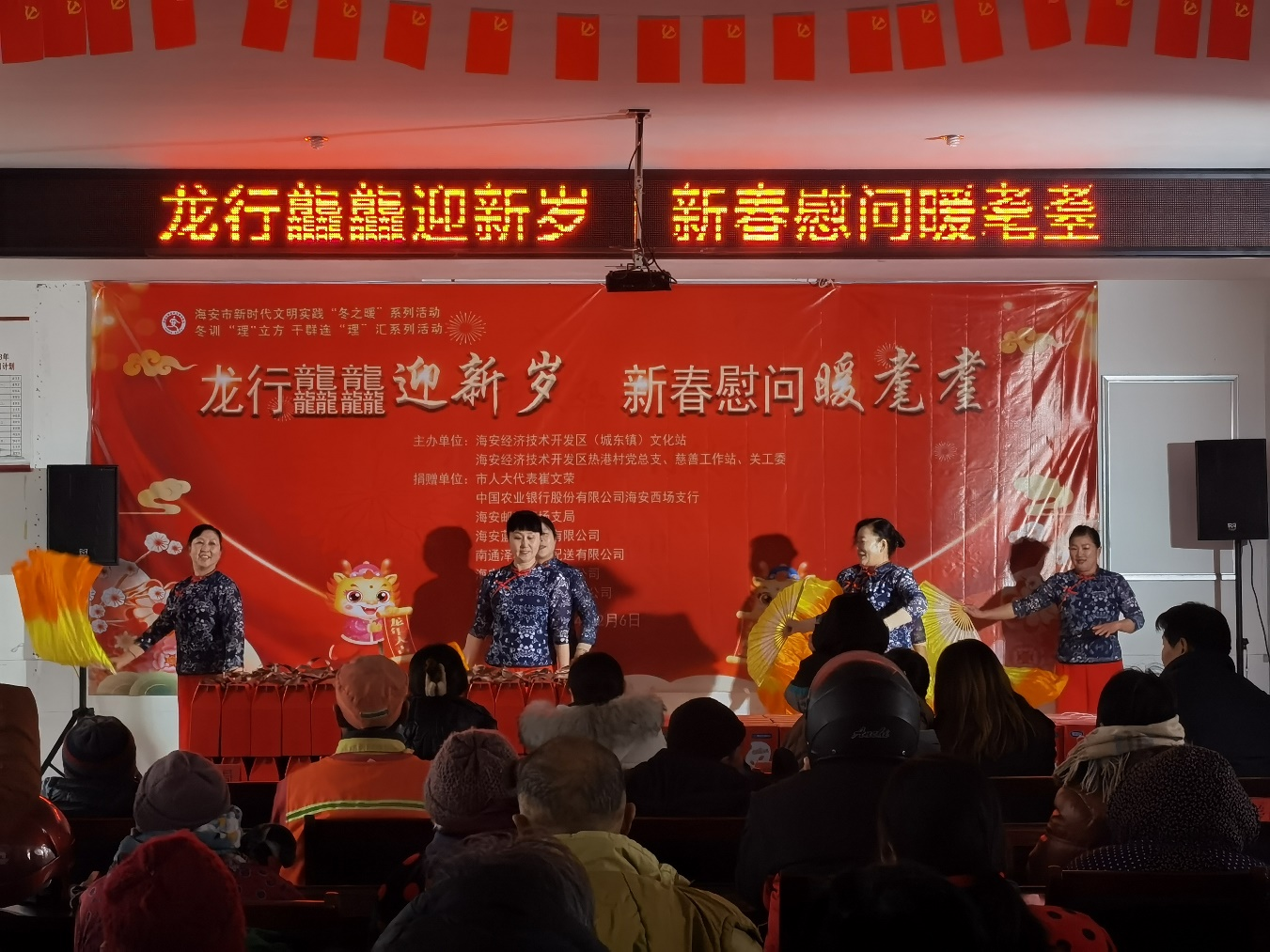 6日下午,由海安开发区文化站、热港村党总支和南通理工学院海安校区大学生志愿者联合开展的“龙行龘龘迎新岁,新春慰问暖耄耋”主题活动在热港村党群服务中心举行,全村100多名85周岁以上老人或家属代表和580志愿者、企业老总等齐聚一堂,共贺新春。