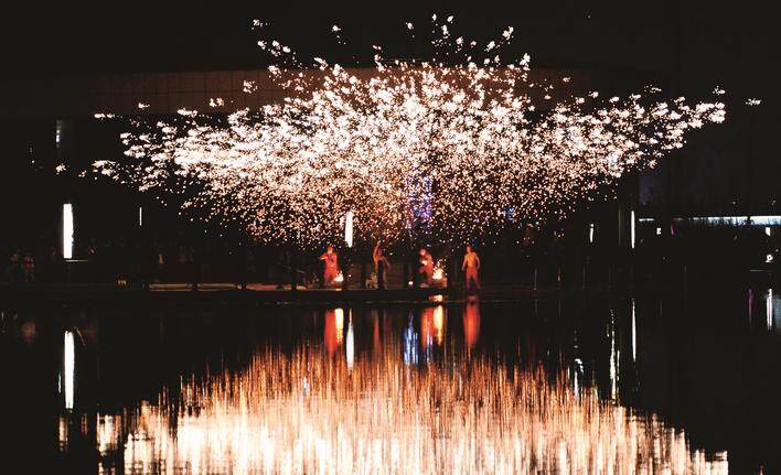 13日,海门区府南绿廊举行非遗打铁花表演,现场铁花飞溅,观众们大开眼界。 施敏