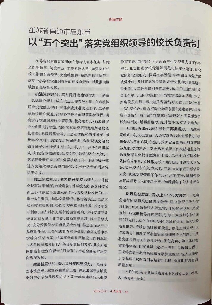据了解,启东市以“五个突出”落实党组织领导的校长负责制,侧重在五大方面寻求突破:“突出加强党的领导,着力提升政治领导力;突出健全制度机制,着力提升学校治理能力;突出建强基层组织,着力提升支部组织力;突出加强队伍建设,着力提升干部担当力;突出促进融合发展,着力提升学校发展力。”