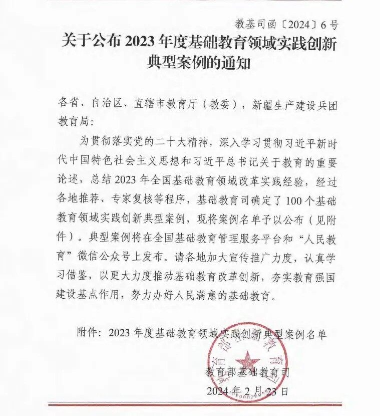 记者昨天获悉,中国教育部《2023中国基础教育年度报告》正式公布,2023年全国基础教育实践创新典型案例,全国共有100个典型案例入选,在江苏入选的6例中,南通占3例。
