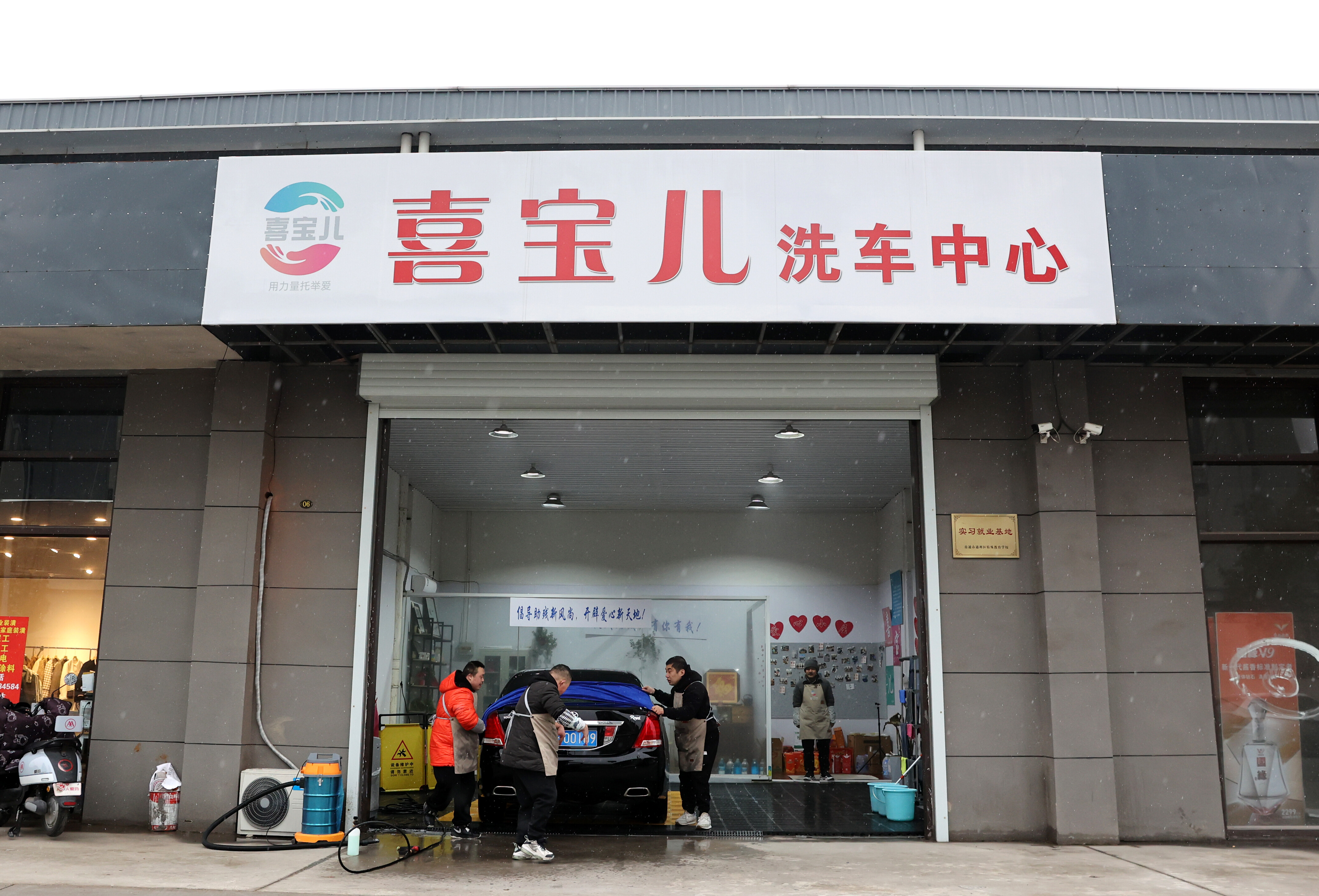 喷水、泡沫、打磨、擦洗……3月21日,徐夏、王培宇、季秋阳、纪增伟4名洗车工分工明确、配合默契地认真工作。当日,退役举重冠军季辉开的第二家喜宝儿洗车店开业,店员均为毕业于通州区特殊教育学校的唐氏综合征等残障青年。