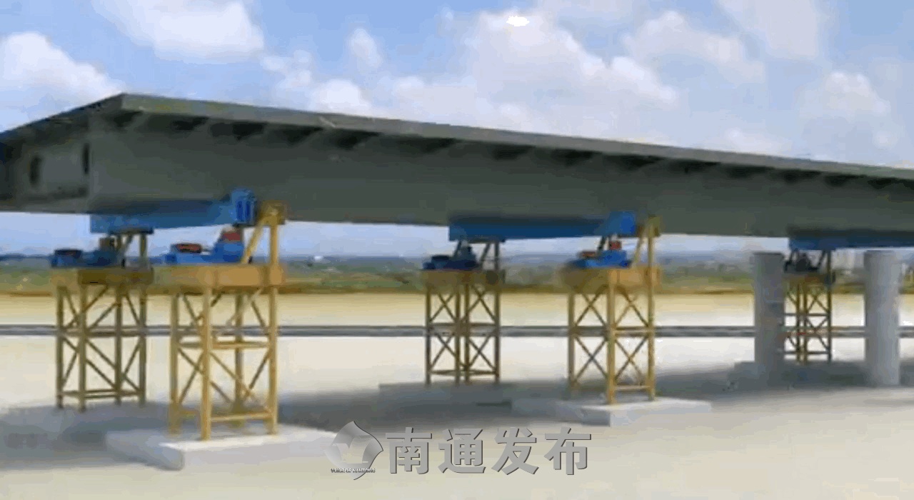 新联枢纽共有两次钢箱梁顶推施工,还有一次顶推施工位于新联枢纽E匝道上跨G15沈海高速位置,实施的梁体长60米,宽10.5米,重约330吨,已经于2023年3月2日顺利完成落梁工作。