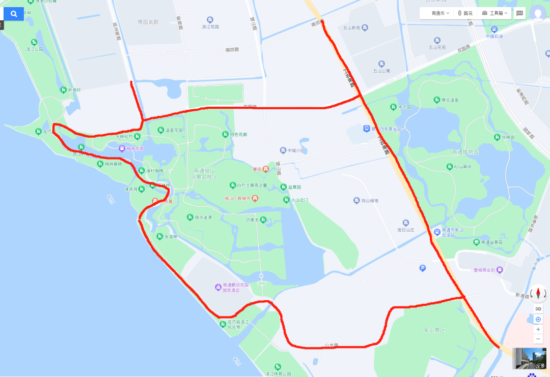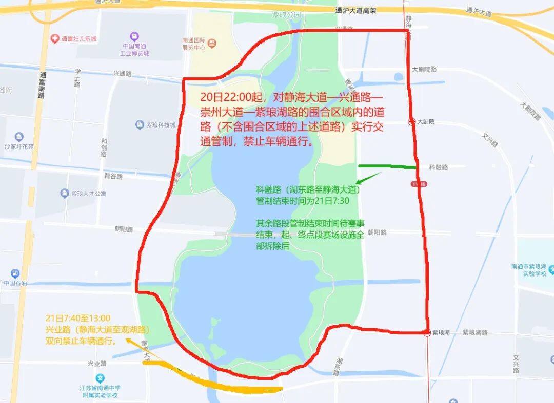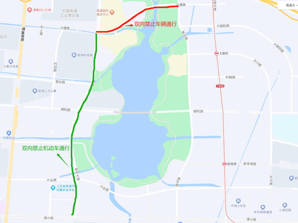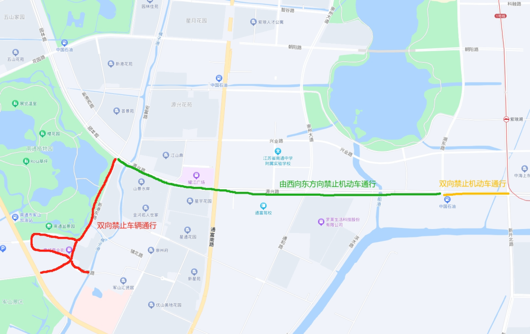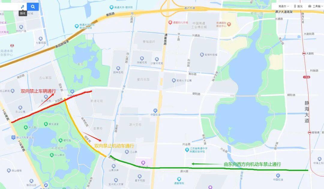 花园路(工农南路至跃龙南路)、跃龙南路(花月路至龙源路)、龙源路(全段)、景区道路(黄泥山路、狼山森林步道)、山水路(景区道路至工农南路),双向禁止车辆通行。
