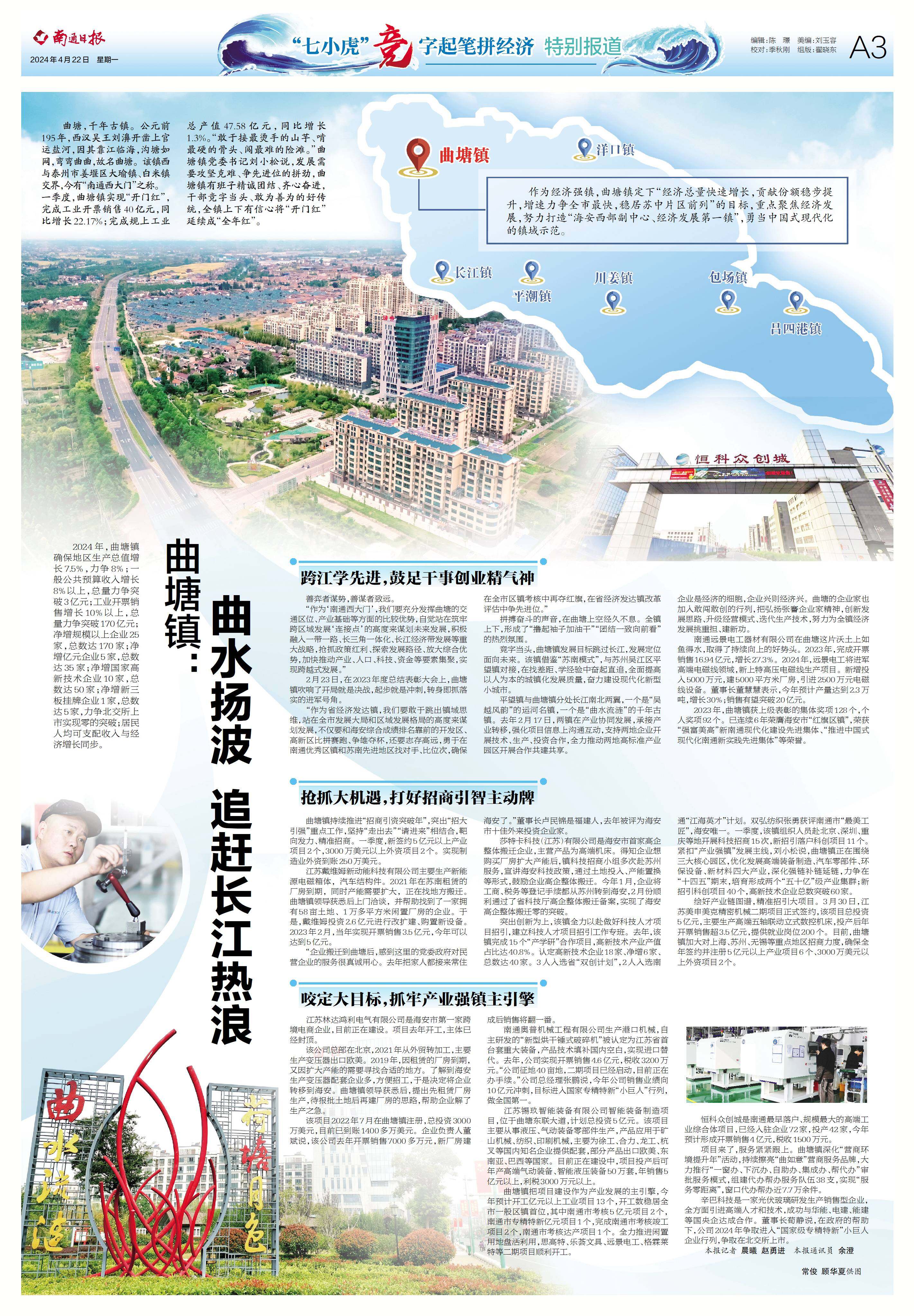 “作为‘南通西大门’,我们要充分发挥曲塘的交通区位、产业基础等方面的比较优势,自觉站在筑牢跨区域发展‘连接点’的高度来谋划未来发展,积极融入一带一路、长三角一体化、长江经济带发展等重大战略,抢抓政策红利、探索发展路径、放大综合优势,加快推动产业、人口、科技、资金等要素集聚,实现跨越式发展。”