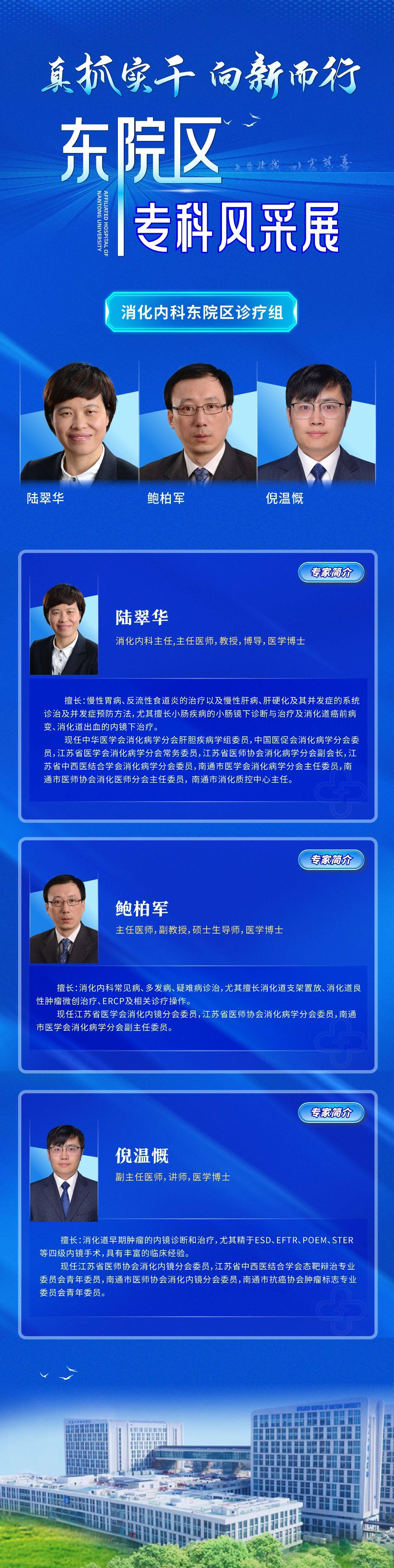 作为国务院首批批准的硕士学位授权点,南通大学首批博士学位授权点,江苏省首批临床重点专科,我院消化内科设有消化内科病房、消化内镜中心以及消化病研究所,现有医、护、技等人员95名,其中教授、主任医师16名,副教授、副主任医师8名,讲师、主治医师7名,博士19名,博导3名,硕导17名,拥有多名省市级重点人才。