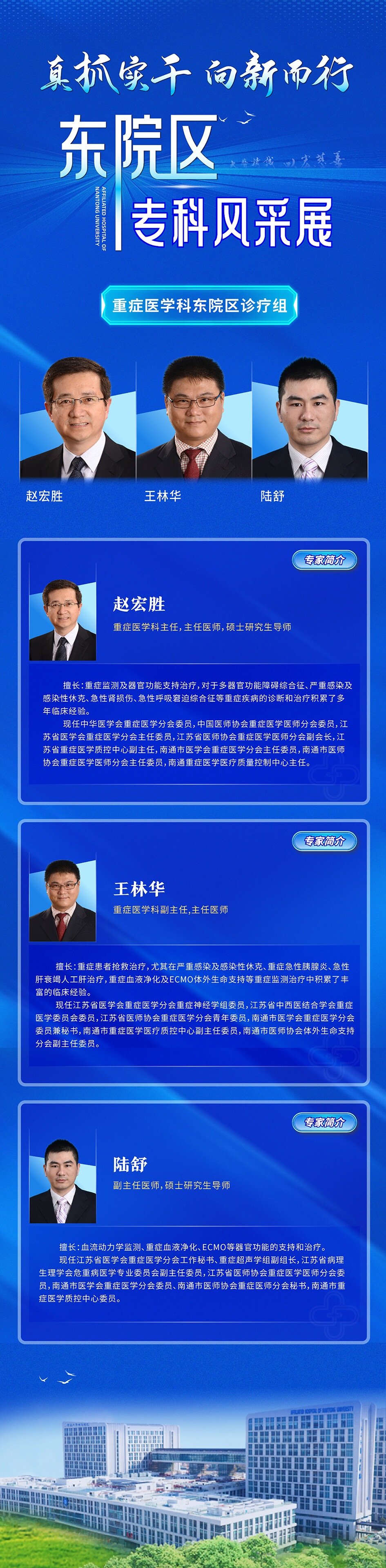 学科的持续发展,离不开人才的培养。重症医学科目前有医护人员100余人,硕士研究生导师5人,中华医学会重症医学5C专科资质医师15人,参加海外专业研修项目5人,有多位医师在各级重症医学专科分会学术任职。赵宏胜主任从事重症医学专业30余年,于2022年当选江苏省医学会重症医学分会主任委员,奠定了通大附院重症医学科在省内乃至全国的学术地位及专业影响力。重症医学科副主任陆洋、王林华及副主任医师陆舒等,分别在江苏省及南通市重症医学专科分会及重症质控中心学术任职。