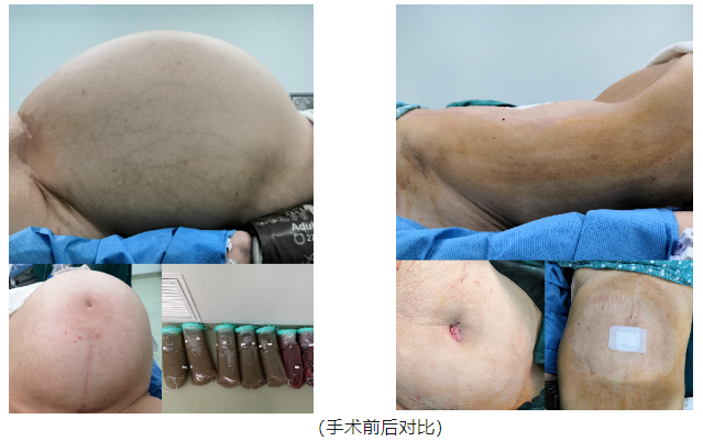 2022年4月,一名“大肚翩翩”的中年女性走进南通大学附属医院妇科杨晓清主任的诊室,经过详细询问,患者两年前发现腹部逐渐隆起,以为自己肥胖,遂开始自行购买减肥药进行减肥,哪知“越减越肥”,肚子逐渐隆起,但仍未引起重视。直至一月前患者因为“急性胃肠炎”,于当地卫生诊室就诊,体检医生建议需立即至上级医院体检,遂至当地医院就诊,发现盆腔巨大包块,当地医院腔内超声提示包块大小无法测量,更不敢接收这样的患者进行手术,患者遂至通大附院就诊后收住妇科张玉泉、杨晓清教授团队组治疗。术前测量患者“宫高”62cm,腹围124cm,肿瘤直径约50cm,初步诊断为“巨大卵巢肿瘤”。经过周密严谨的术前讨论及充分论证,妇产诊疗团队利用患者脐部2cm小切口,实施单孔腹腔镜技术下肿瘤切除,术中共抽吸出囊液约2万毫升,2小时后患者成功减重约40斤。术后患者病情平稳,迅速恢复,只是感叹“白白吃了”两年的减肥药。杨晓清主任告诉记者:“若行传统多孔腹腔镜手术,因腹部肿瘤巨大膨隆,手术器械将无法进入腹腔,而经腹手术则创伤大,腹部瘢痕明显。而单孔腹腔镜可以利用脐部的天然皮肤皱褶2cm切口穿刺引流液体,同时术后隐藏手术切口疤痕,达到令患者满意的美容效果,可以达到真正的术后无痕。”我院妇科不仅在南通市率先开展了经脐的单孔腹腔镜,也是首先开展经阴道单孔腹腔镜手术(VNOTES)的科室,可以满足通城女性爱美的需求,实现手术的快速康复。”