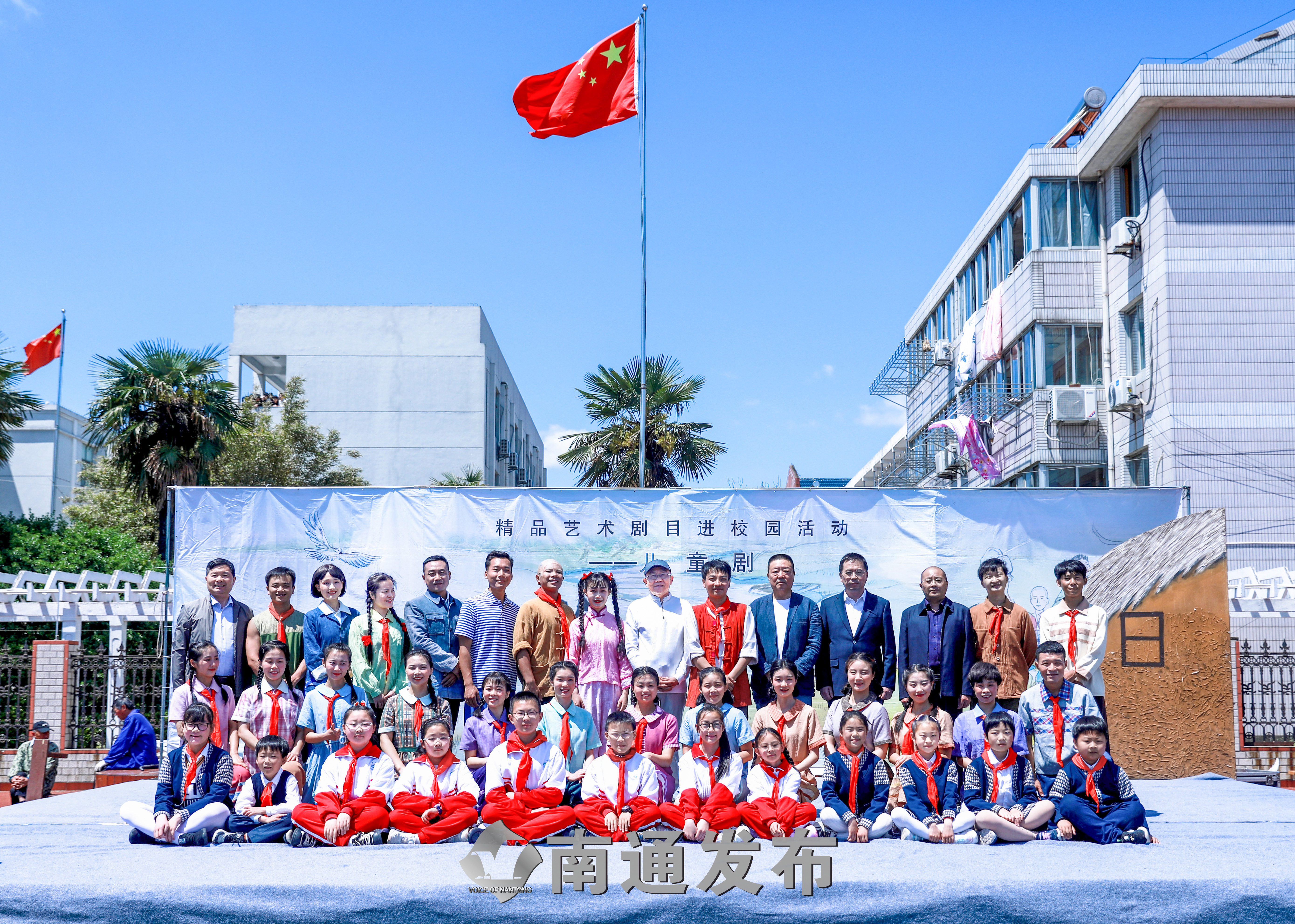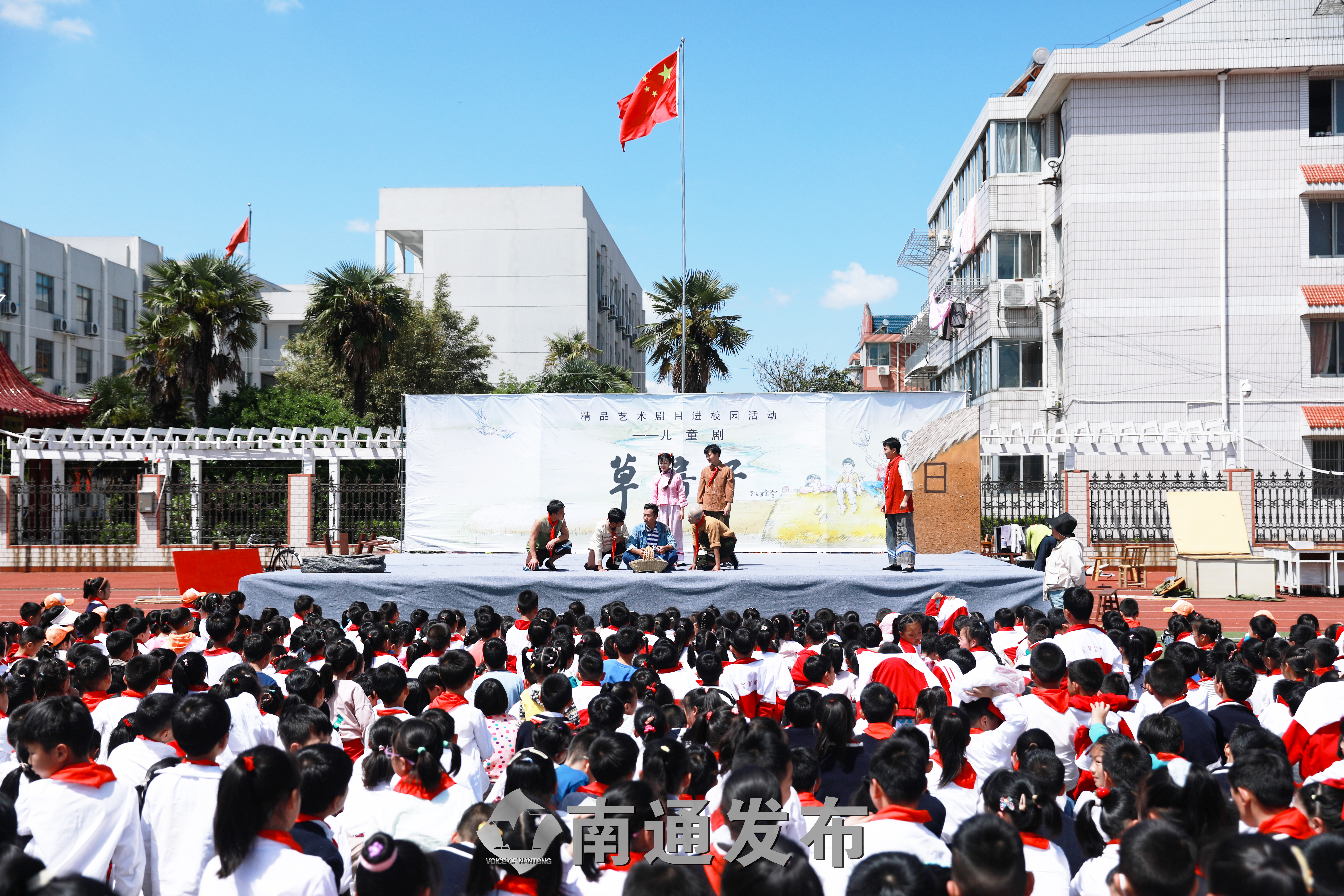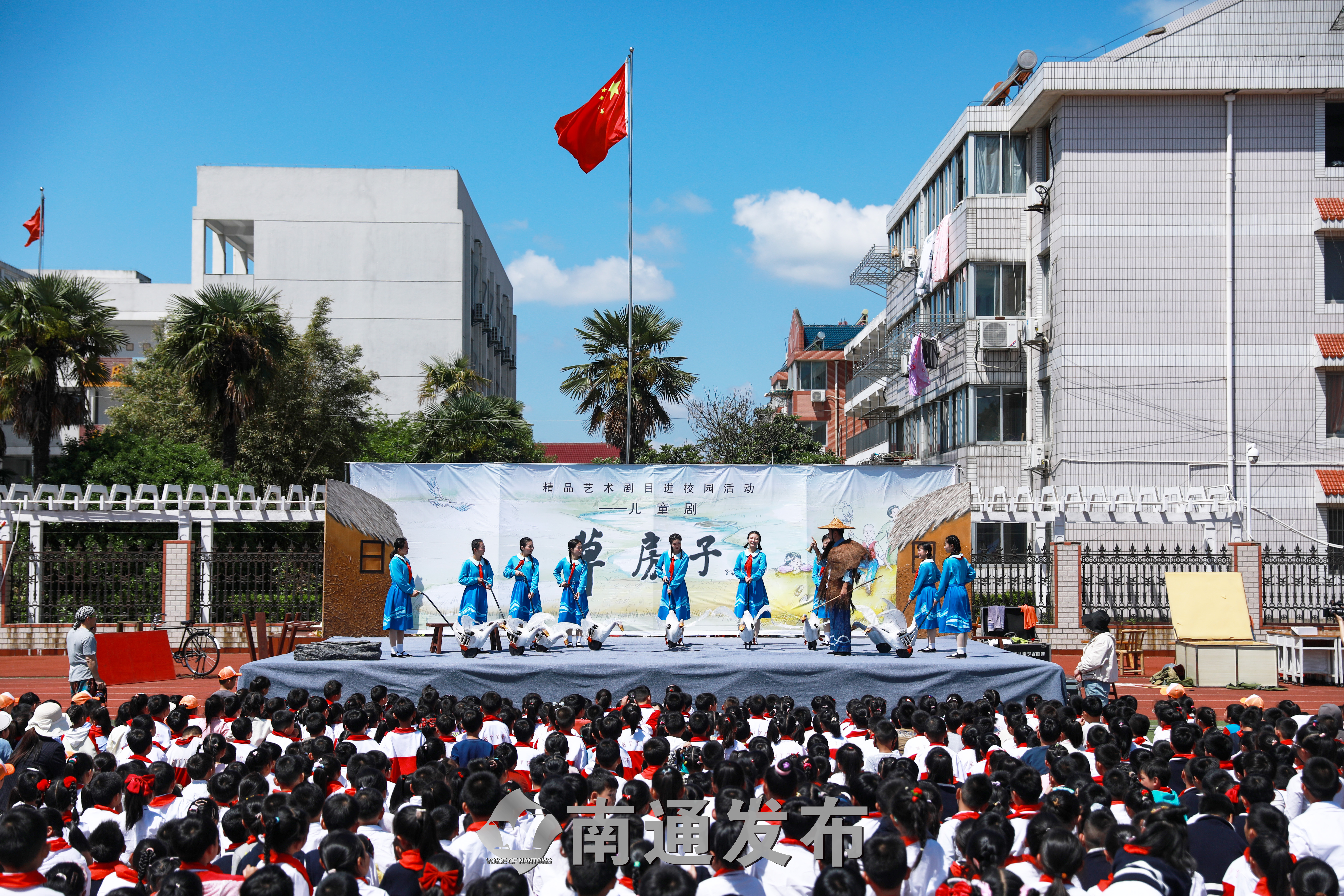 5月8日上午,阳光明媚,在绿草如茵的操场上,南通市韬奋小学的孩子们席地而坐,望眼欲穿地看着操场边刚搭起的《草房子》舞台。这是韬奋小学的孩子们第一次在校园内接触到实景儿童剧,他们沉浸在那片充满爱与梦想的乡村世界里,被这部儿童剧深深打动。
