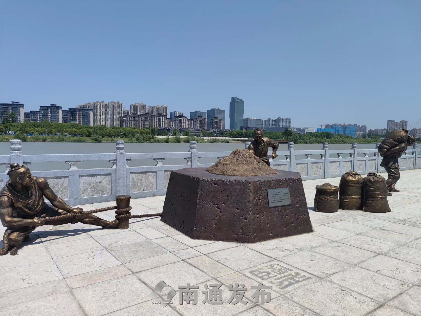 在中段的沿运河边、林荫下,一处“1269”文化艺术小品吸引了我们的目光。有的铲盐、有的挑盐……花岗岩整石及耐候钢板结合的人物雕塑,加上雪白的沙砾铺设而成的“沙滩”,生动展现了运盐码头的繁忙景象。