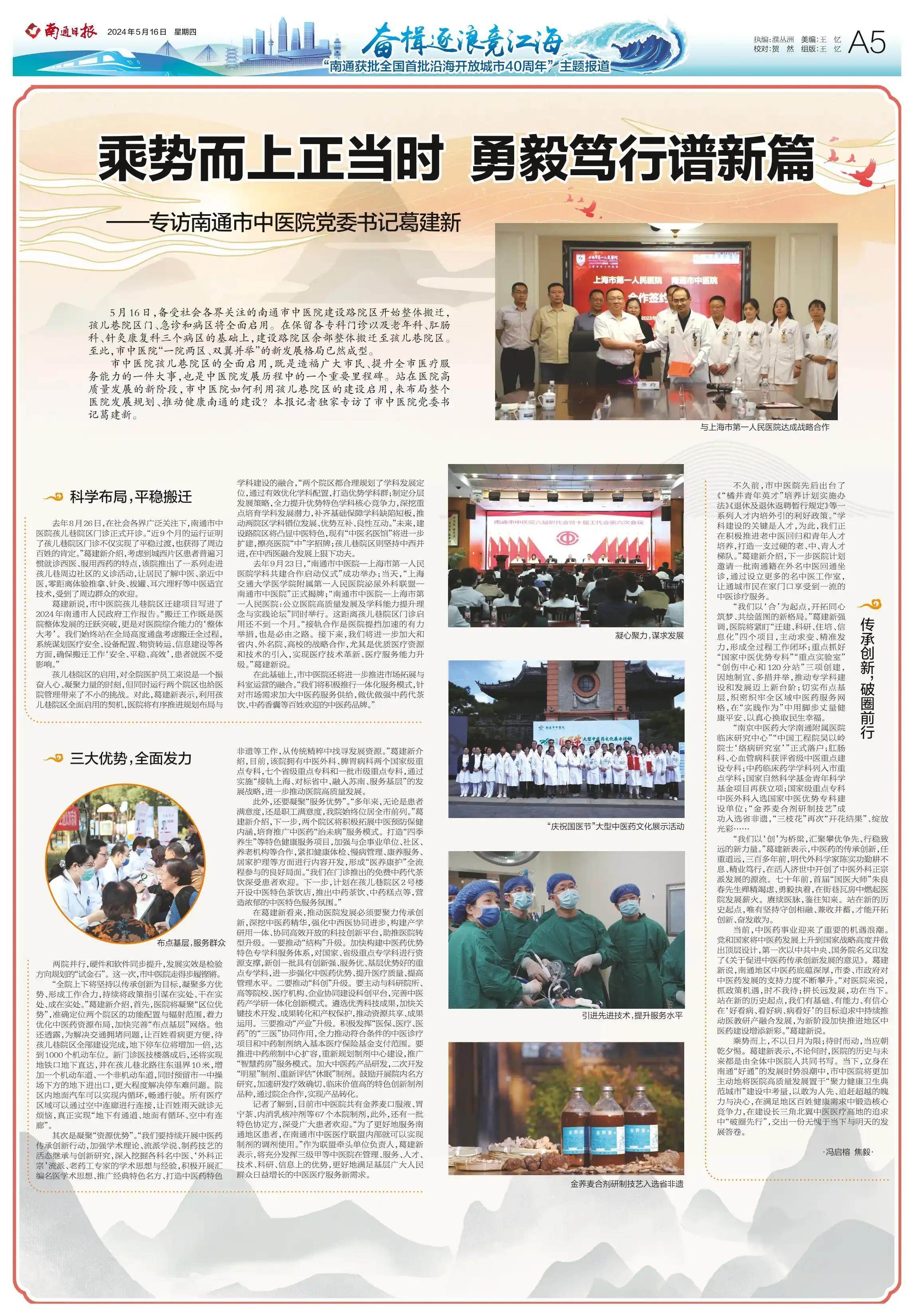 当前,中医药事业迎来了重要的机遇浪潮。党和国家将中医药发展上升到国家战略高度并做出顶层设计,第一次以中共中央、国务院名义印发了《关于促进中医药传承创新发展的意见》。葛建新说,南通地区中医药底蕴深厚,市委、市政府对中医药发展的支持力度不断攀升。“对医院来说,抓政策机遇,时不我待;拼长远发展,功在当下。站在新的历史起点,我们有基础、有能力、有信心在‘好看病、看好病、病看好’的目标追求中持续推动医教研产融合发展,为新阶段加快推进地区中医药建设增添新彩。”葛建新说。