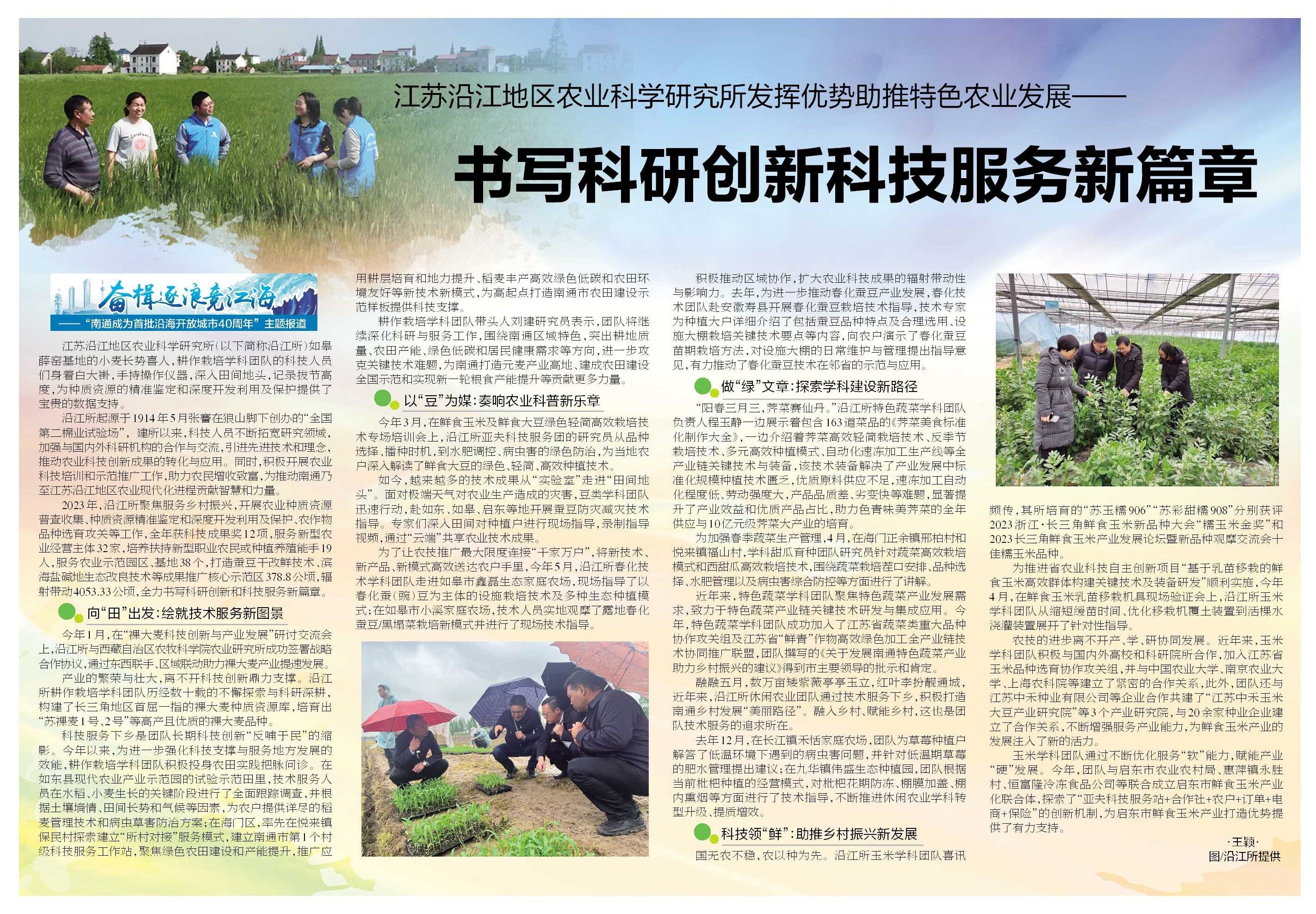 2023年,沿江所聚焦服务乡村振兴,开展农业种质资源普查收集、种质资源精准鉴定和深度开发利用及保护、农作物品种选育攻关等工作,全年获科技成果奖12项,服务新型农业经营主体32家,培养扶持新型职业农民或种植养殖能手19人,服务农业示范园区、基地38个,打造蚕豆干改鲜技术、滨海盐碱地生态改良技术等成果推广核心示范区378.8公顷,辐射带动4053.33公顷,全力书写科研创新和科技服务新篇章。