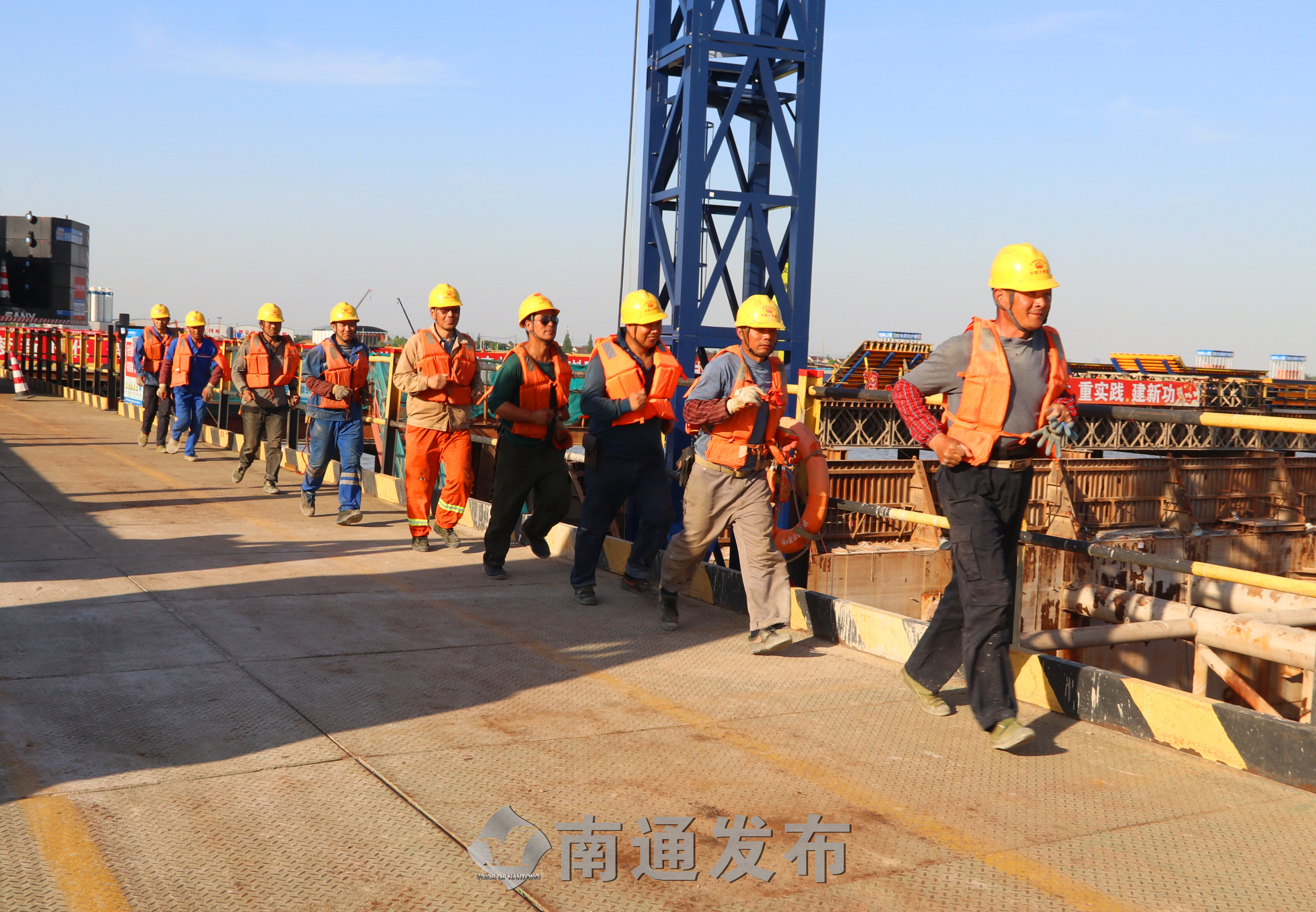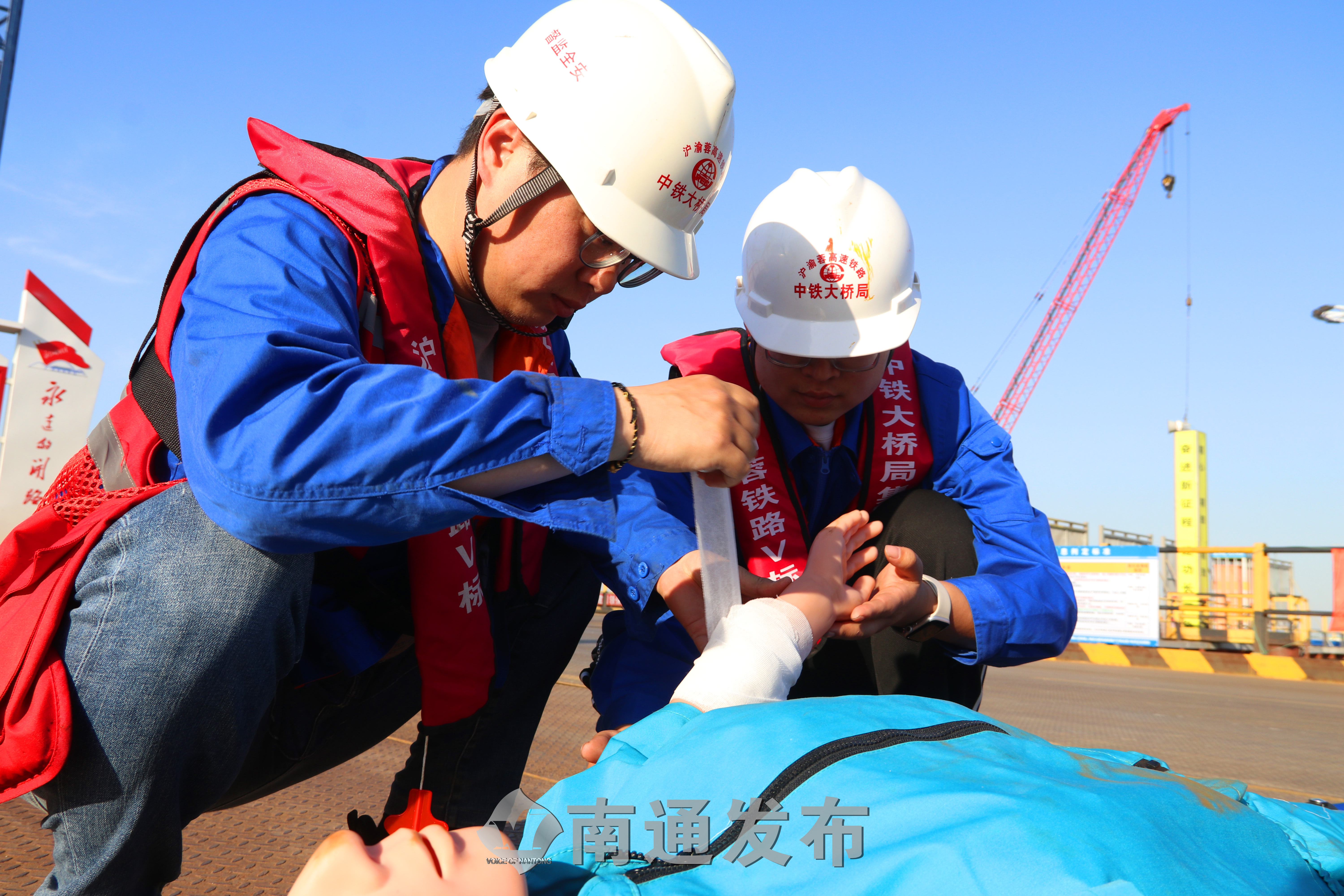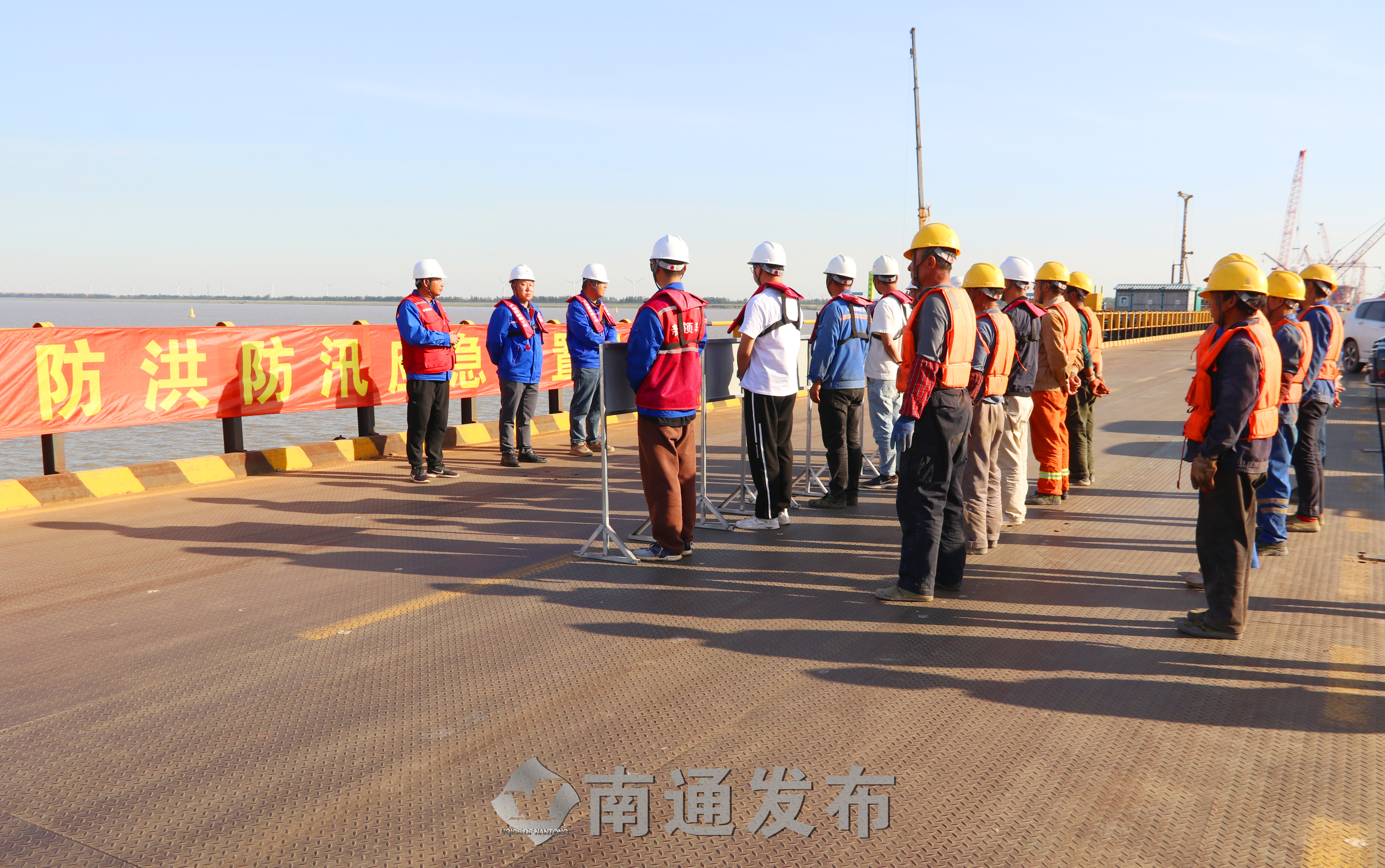 16日,中铁大桥局崇启公铁长江大桥项目部举行防洪防汛应急处置演练。
