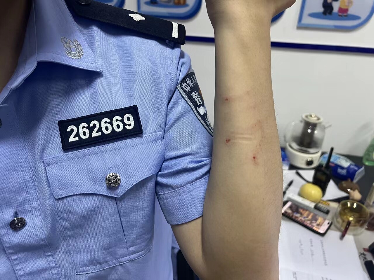 24日晚8时许,市区南川园路上,一名被骗子洗脑、执意转账的女子与前来劝阻的崇川公安分局文峰派出所民警上演“极限拉扯”。为防止女子继续转账,民警一把夺走了女子的手机,结果被女子追着要将手机抢回,其间民警的手臂被女子抓出多道血印。令人欣慰的是,女子最终醒悟。