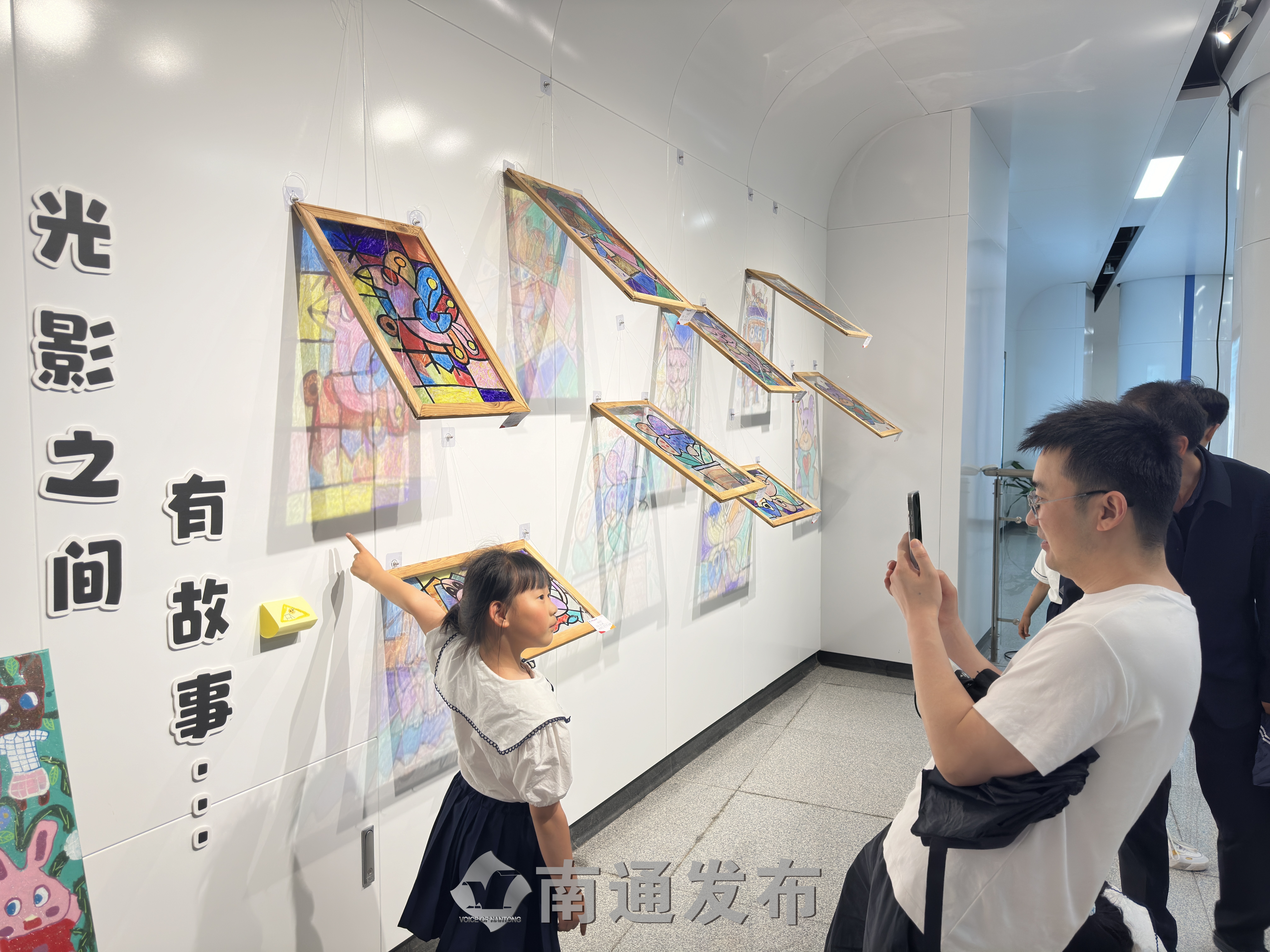 色彩是一种跨越年龄的语言,每一幅作品都是一扇小小的窗口。步入地铁口,同学们迫不及待地拉着家长的手,寻找自己的作品。大一班的陈予童在自己和同学的作品前停留、拍照,她表示:“看到自己的作品非常开心,我喜欢用不同的颜色,去告诉别人我看到的世界。”