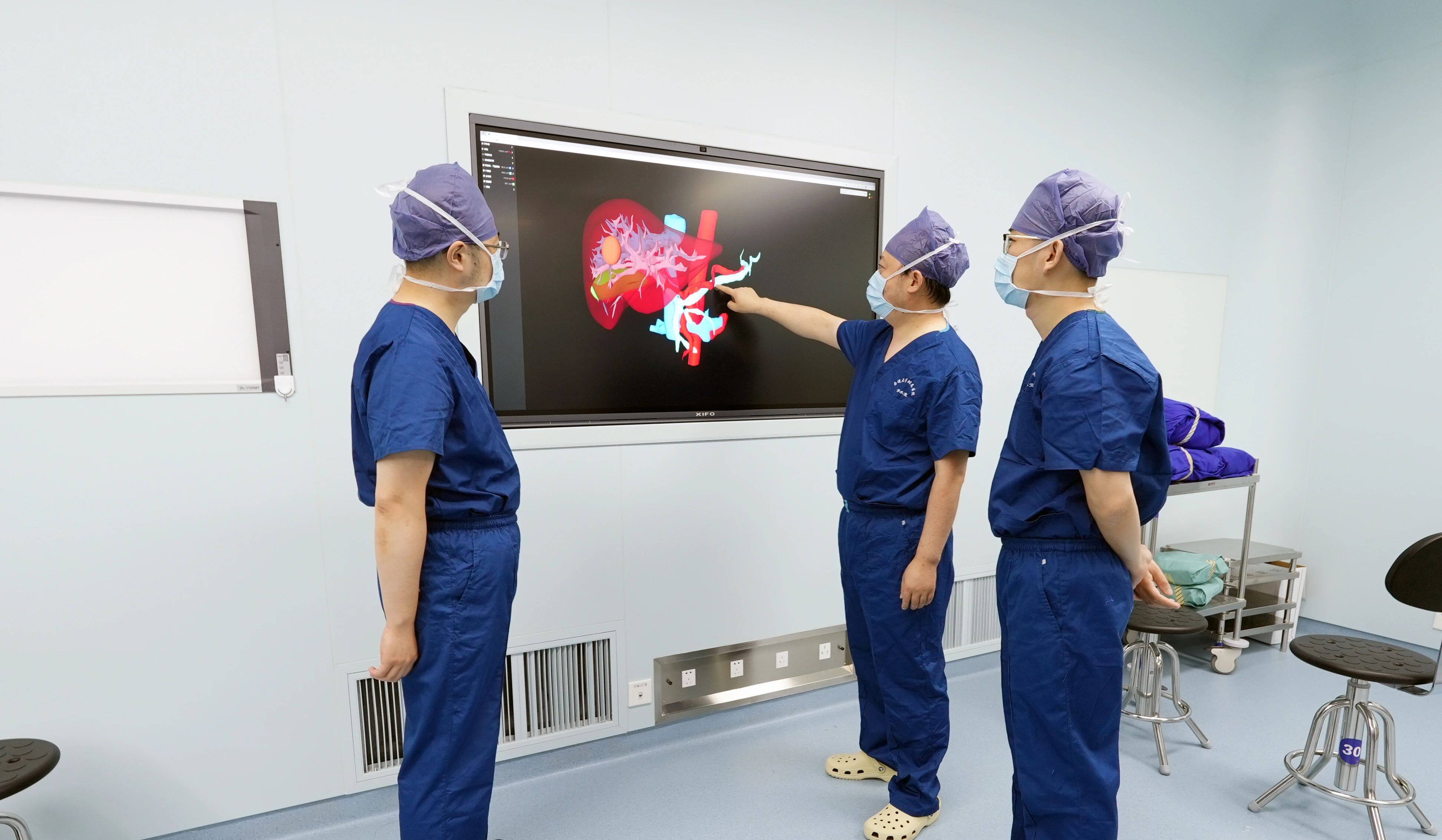 “患者的肿瘤约2.5cm,位置位于肝脏左内叶,同时他希望可以一并解决困扰多年的胆囊结石问题。”肝胆胰脾外科副主任医师郭青松介绍,通过完善术前检查,影像数据智能运算,肝脏肿瘤3D重建,MDT团队综合讨论,最终制定出机器人辅助操作的肝癌切除联合胆囊切除的方案。
