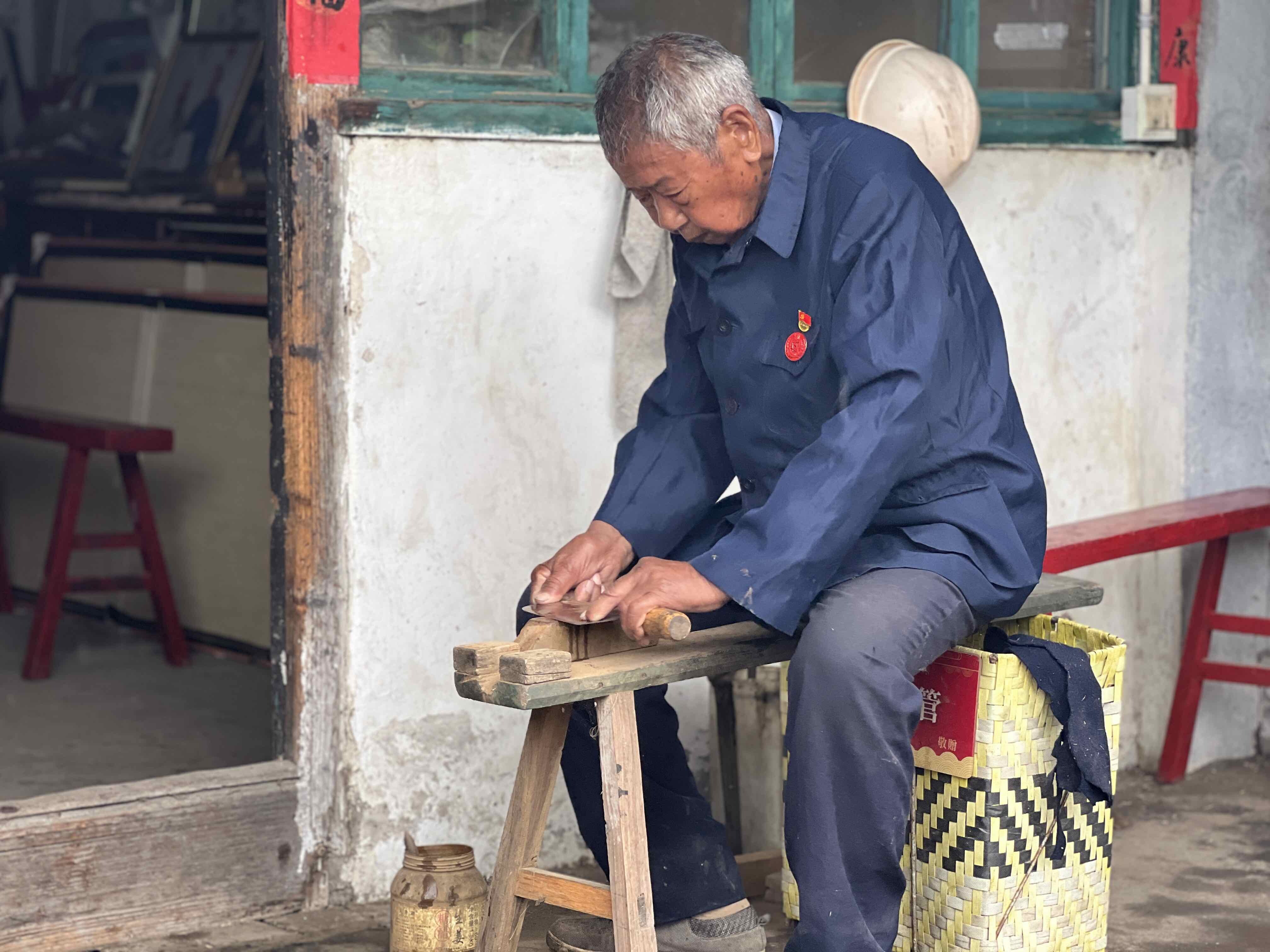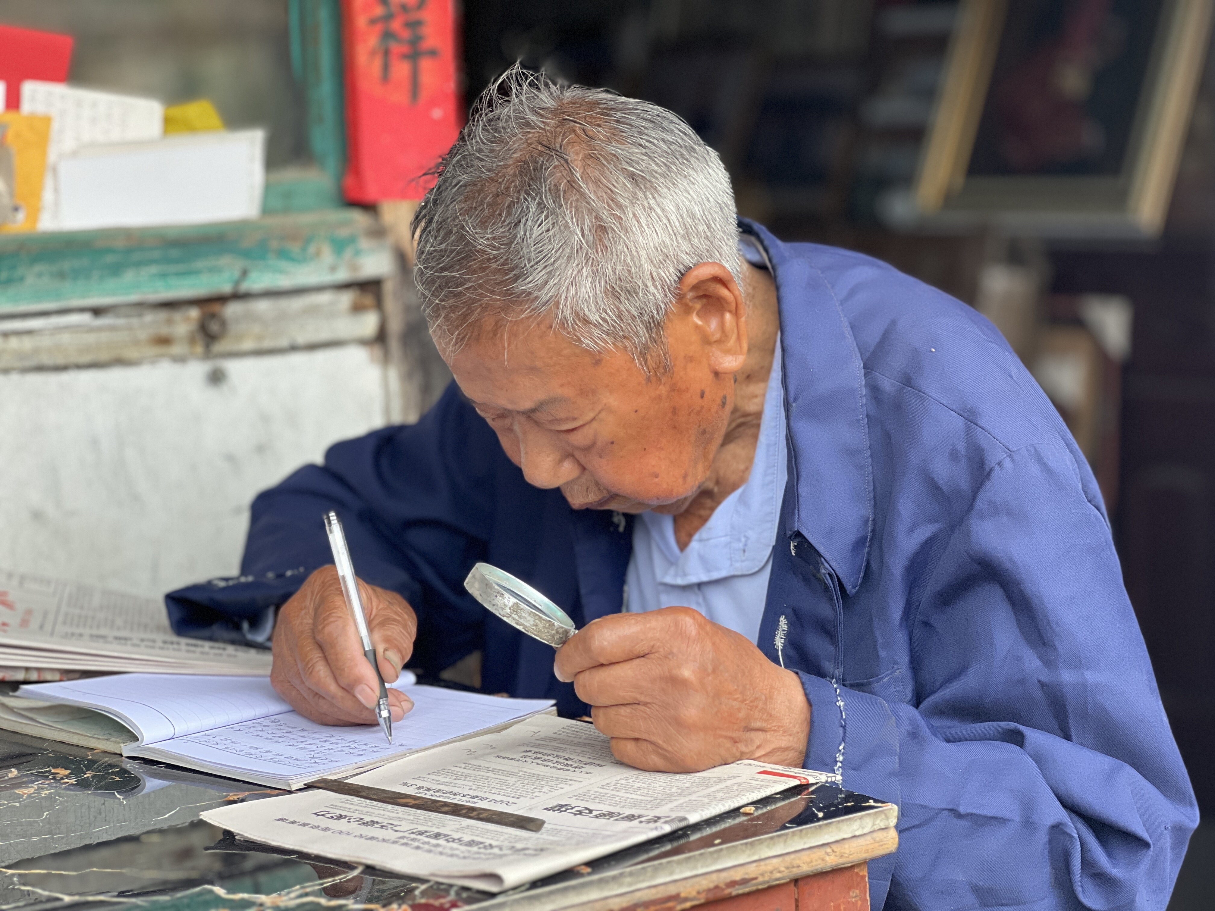 老人卷起的袖口有些磨损,布满皱纹的双手,一手握着笔,一手拿着些许模糊的放大镜,对着铺开的《南通日报》,仔细辨别上面的字。