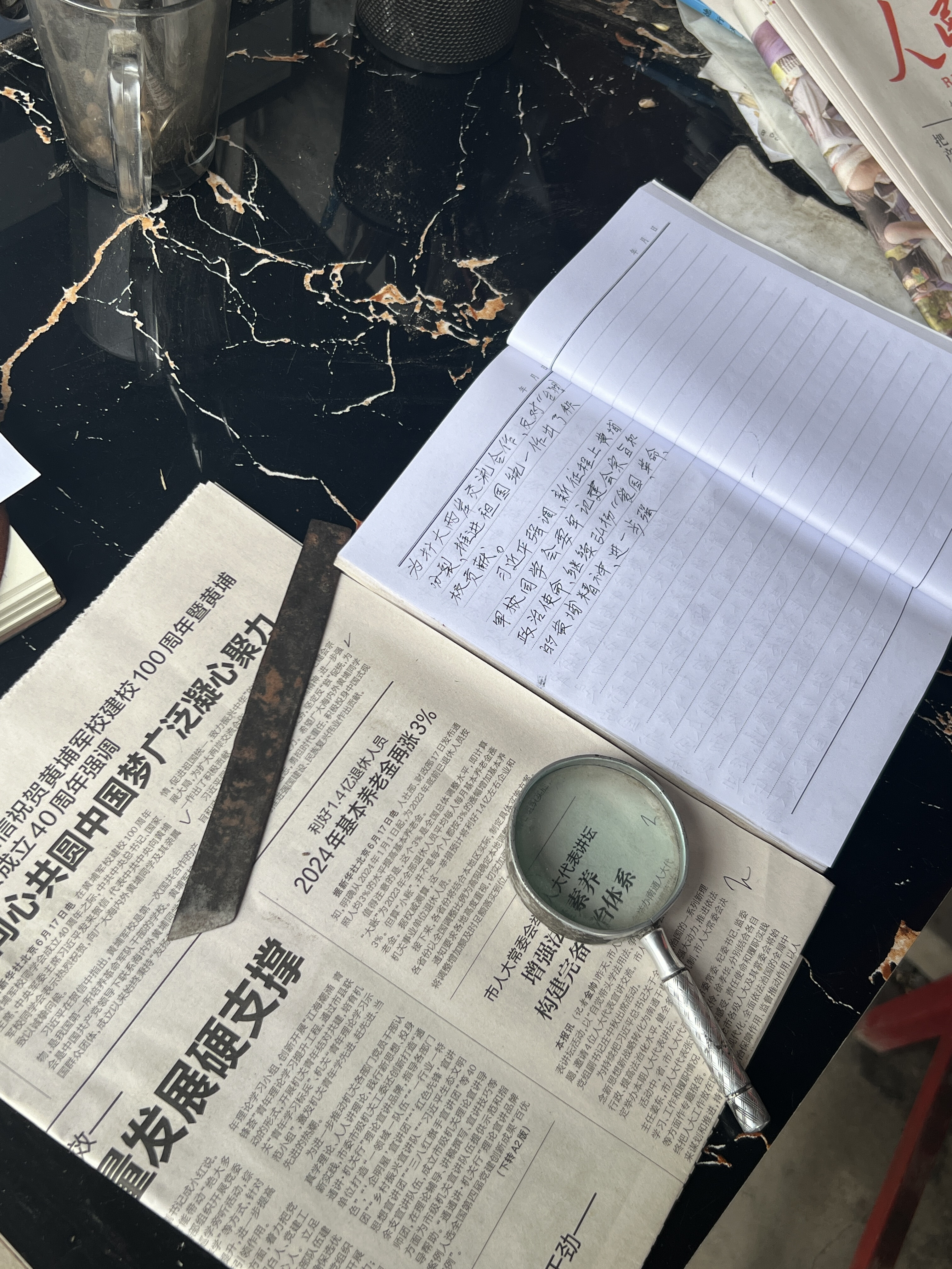一串串雨珠,顺着屋檐往下坠。吴锦泉坐在屋外走廊一张旧桌子前,正摘抄着报纸。