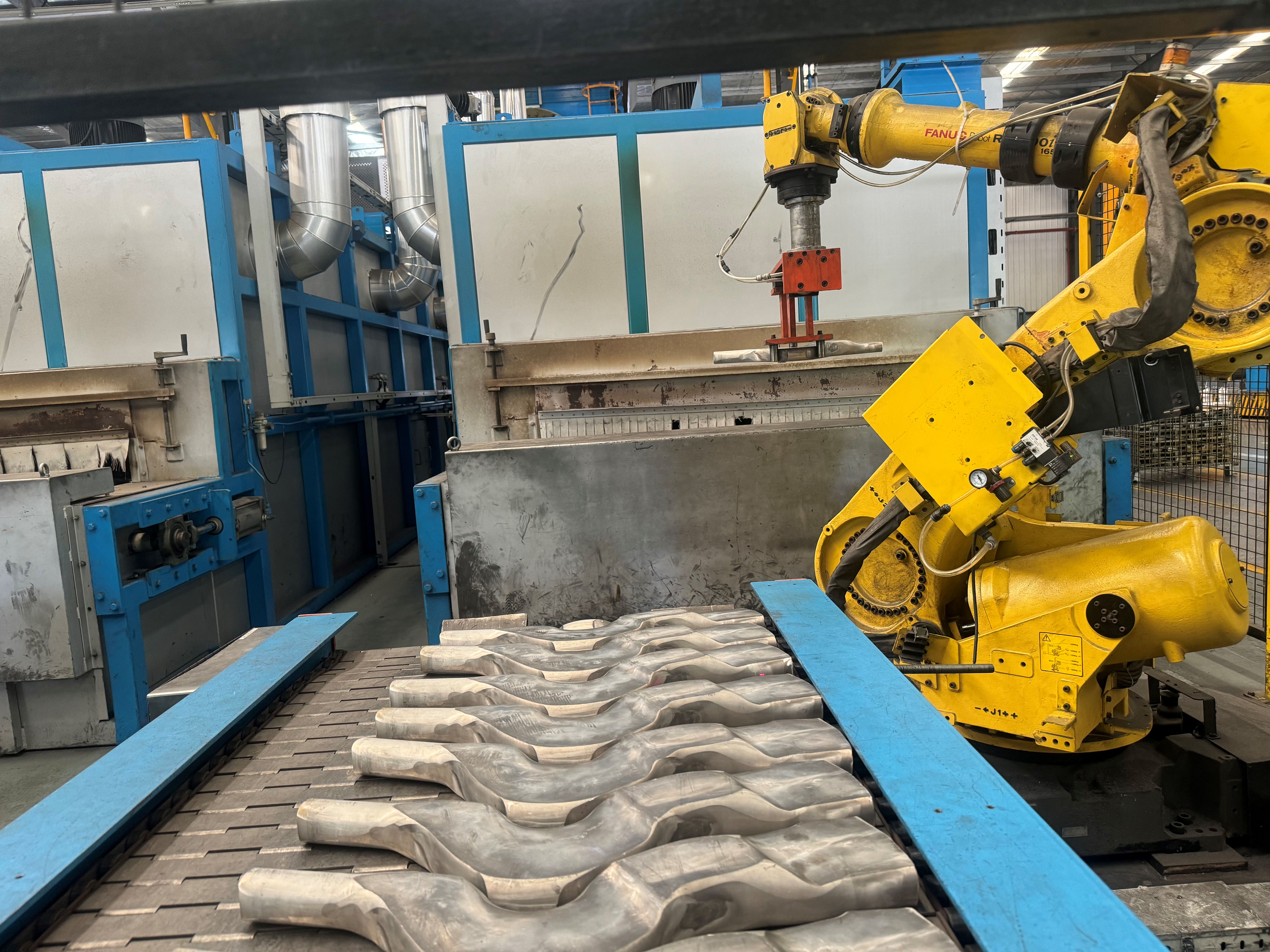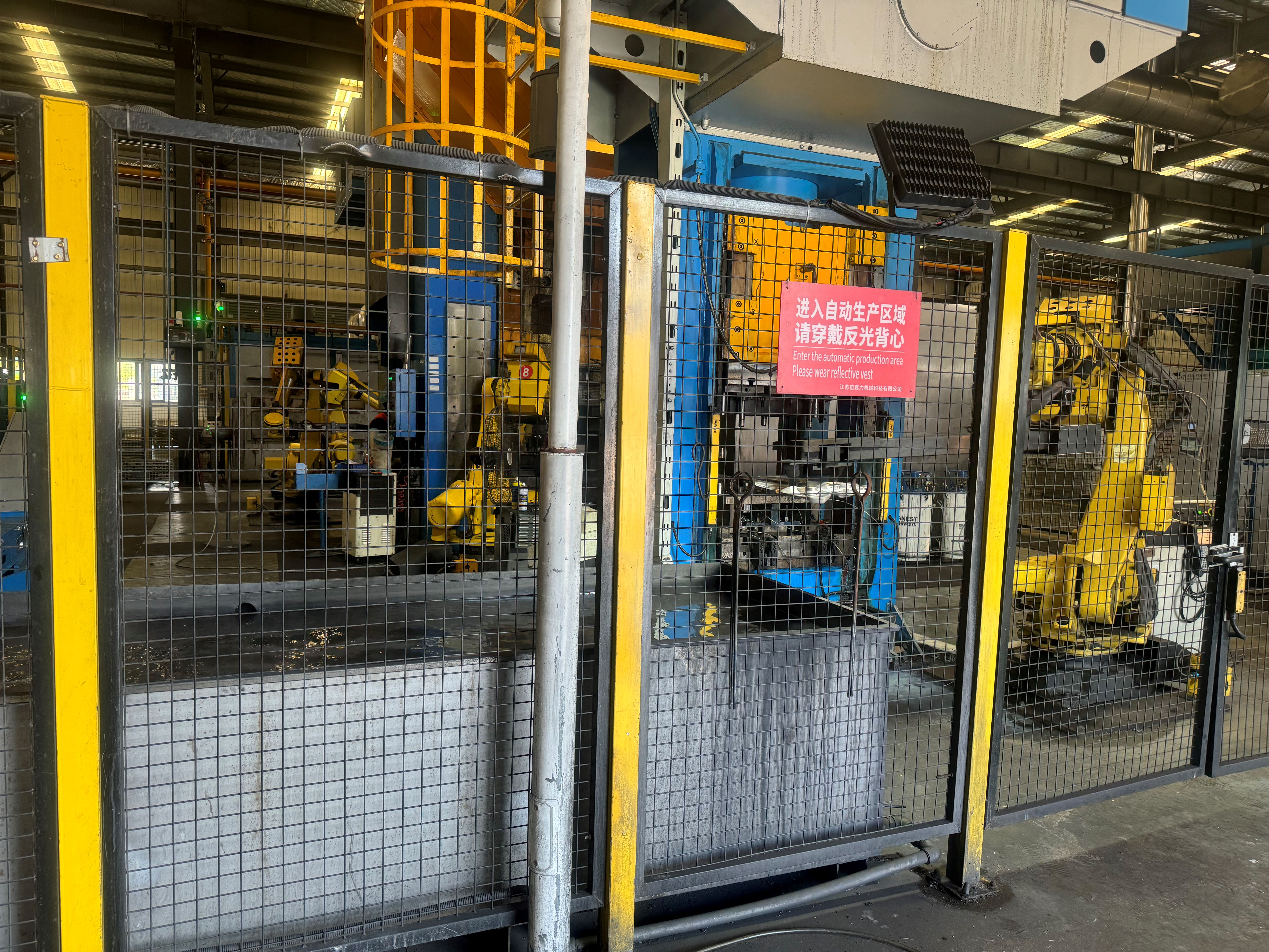 昨天,记者走进江苏倍嘉力机械科技有限公司,生产车间内,铝合金锻造全自动生产线正高速运转。“哐哐……”一只只高大的机器人摇摆着手臂通力合作,将500℃高温的铝合金棒从加热炉中取出,再放进模具内。一根根如手臂粗的棒材经过锻造、切边、热处理等10多道工序,变成各种形状的汽车高强度铝合金控制臂。这条生产线是倍嘉力与中国机械总院集团北京机电研究所共同研发的成果,搭载新上的视觉抓取生产系统,实现了从原材料投放到成品产出的全程无人化操作,整体效率提升50%,同时操作人员减少70%。