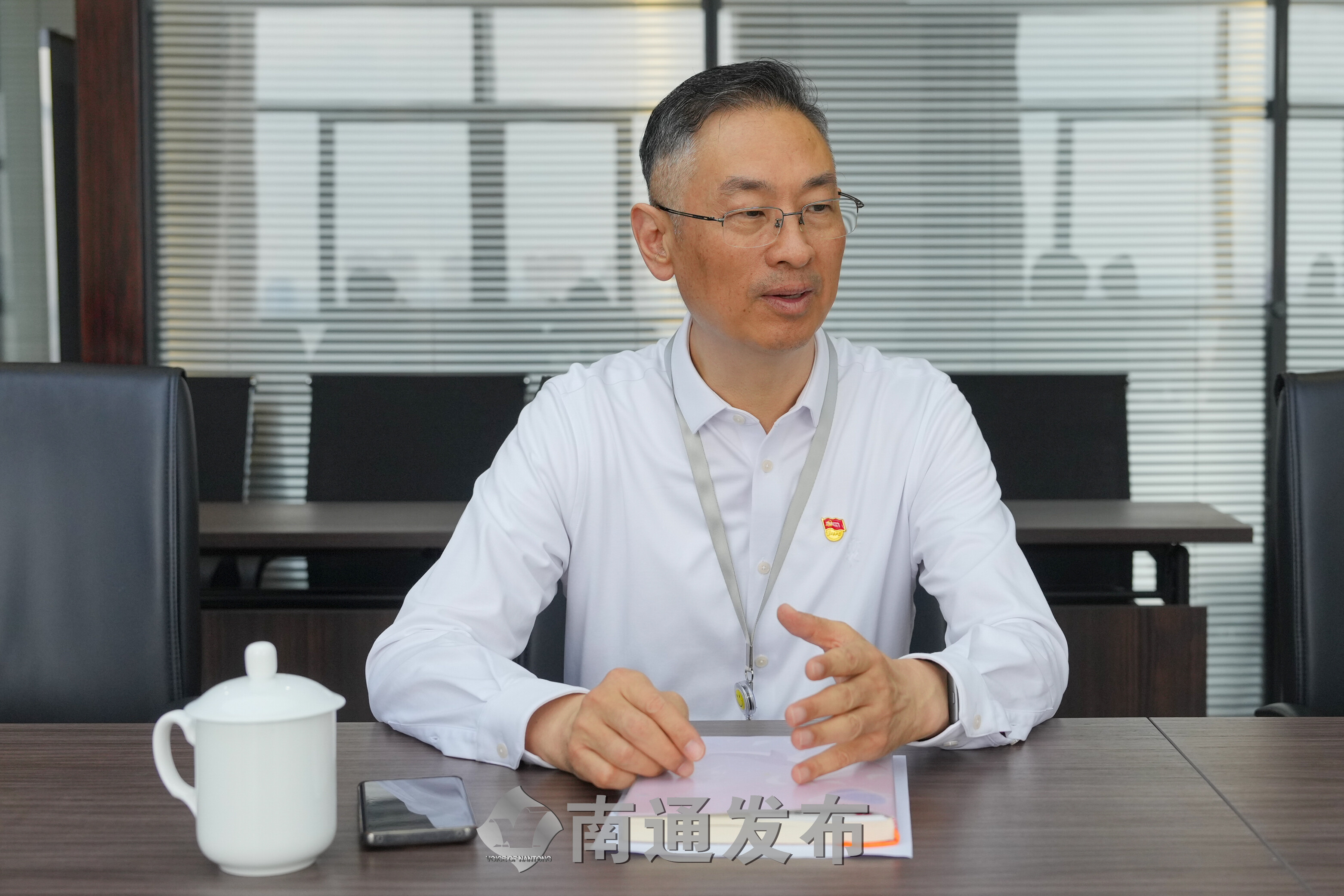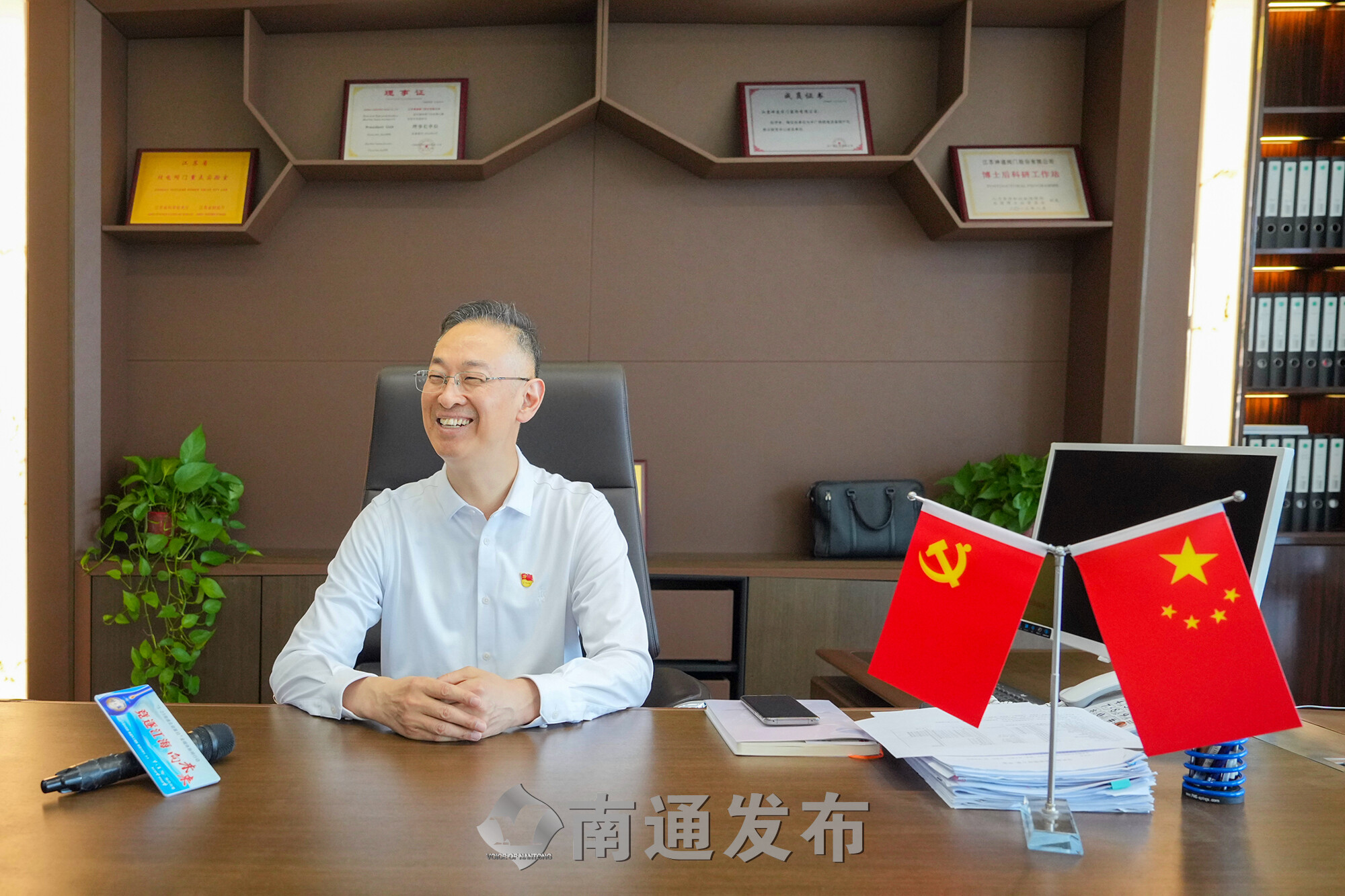 白衬衫,红党徽。江苏神通阀门股份有限公司党委书记兼总裁吴建新与上海来的客商洽谈一结束,就干练地坐在记者对面接受采访。