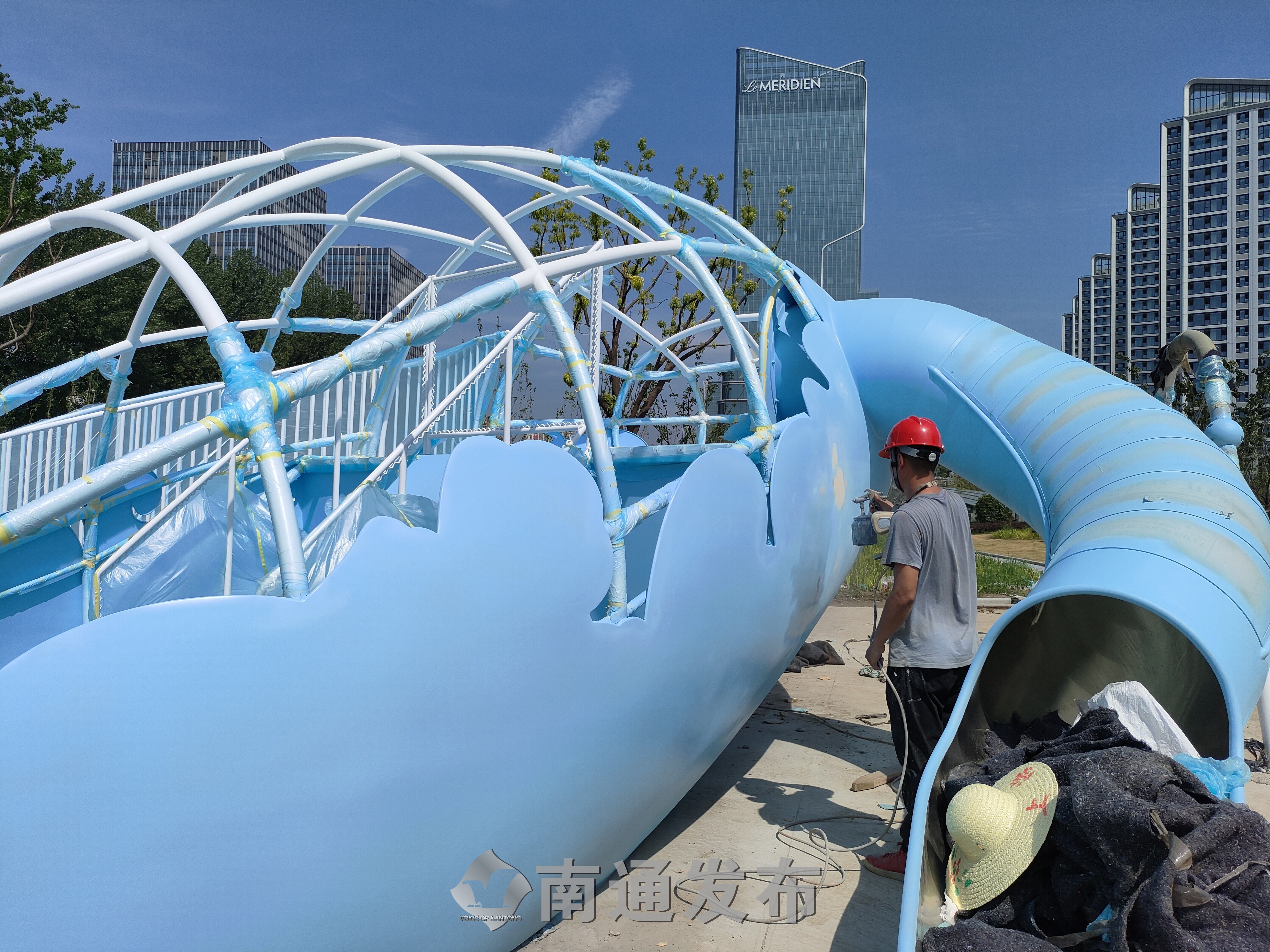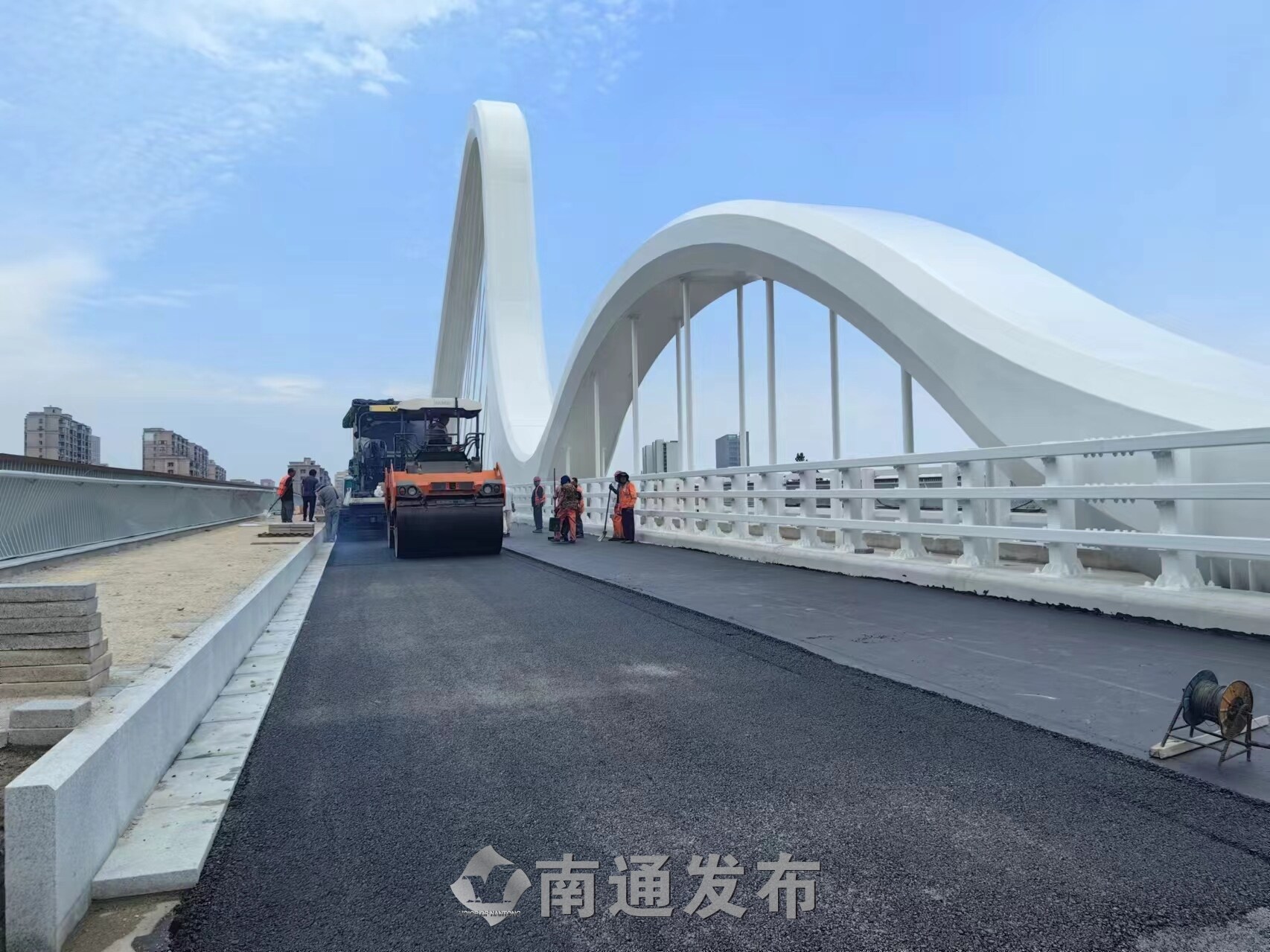 该点位的南侧大约500米处,就是永昌路大桥,只见桥底下旋转楼梯处,焊花飞溅。1名工人一手举着防护罩、一手焊接旋转楼梯灯带骨架,另1名工人拉紧灯带另一侧,做好辅助工作。为了防止焊接烫伤,两人身着厚厚的外套。“焊接工作,应该是除了沥青摊铺外,比较‘火热’的工种了。”宋胜南介绍,就在前几天的桥面沥青摊铺中,大家也都是“全副武装”,“100多度的沥青,在太阳的烘烤下,热辣滚烫。”