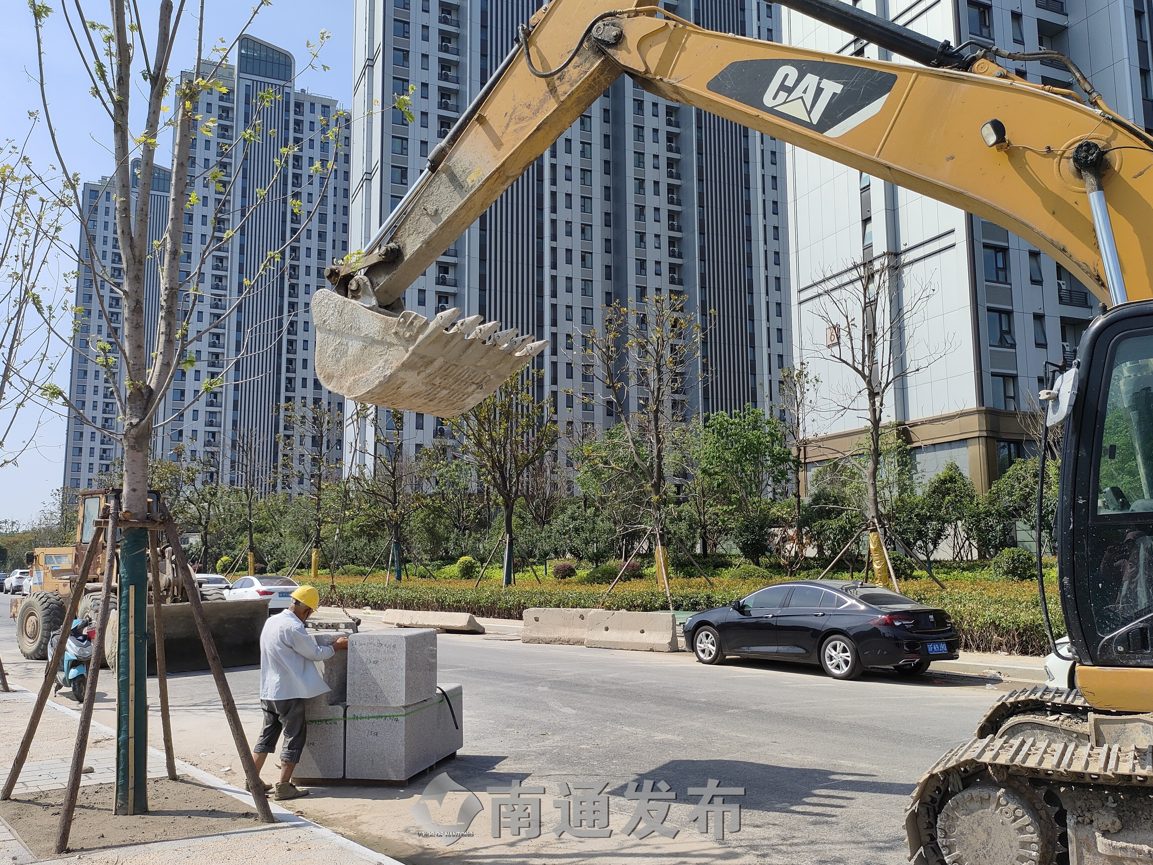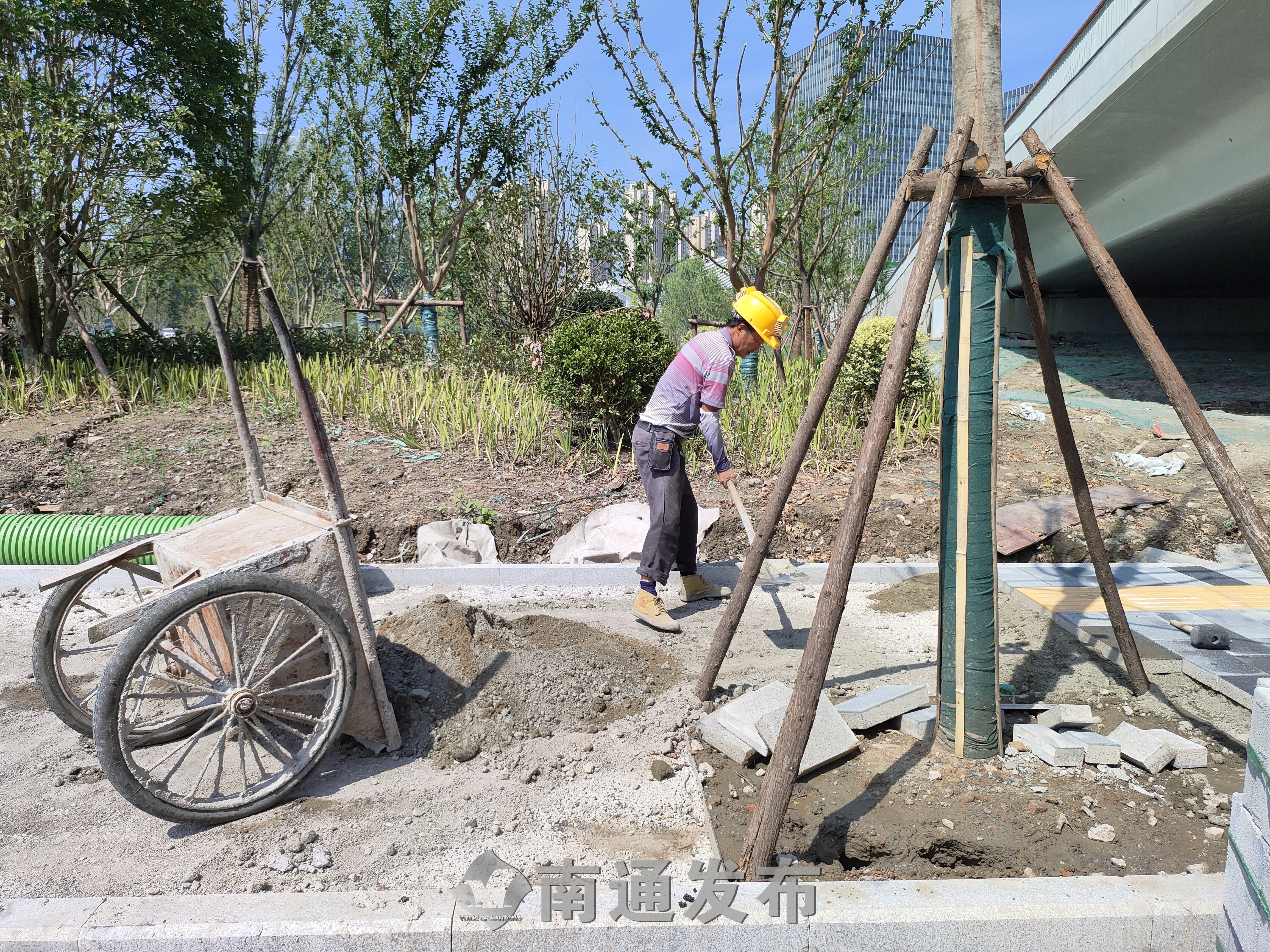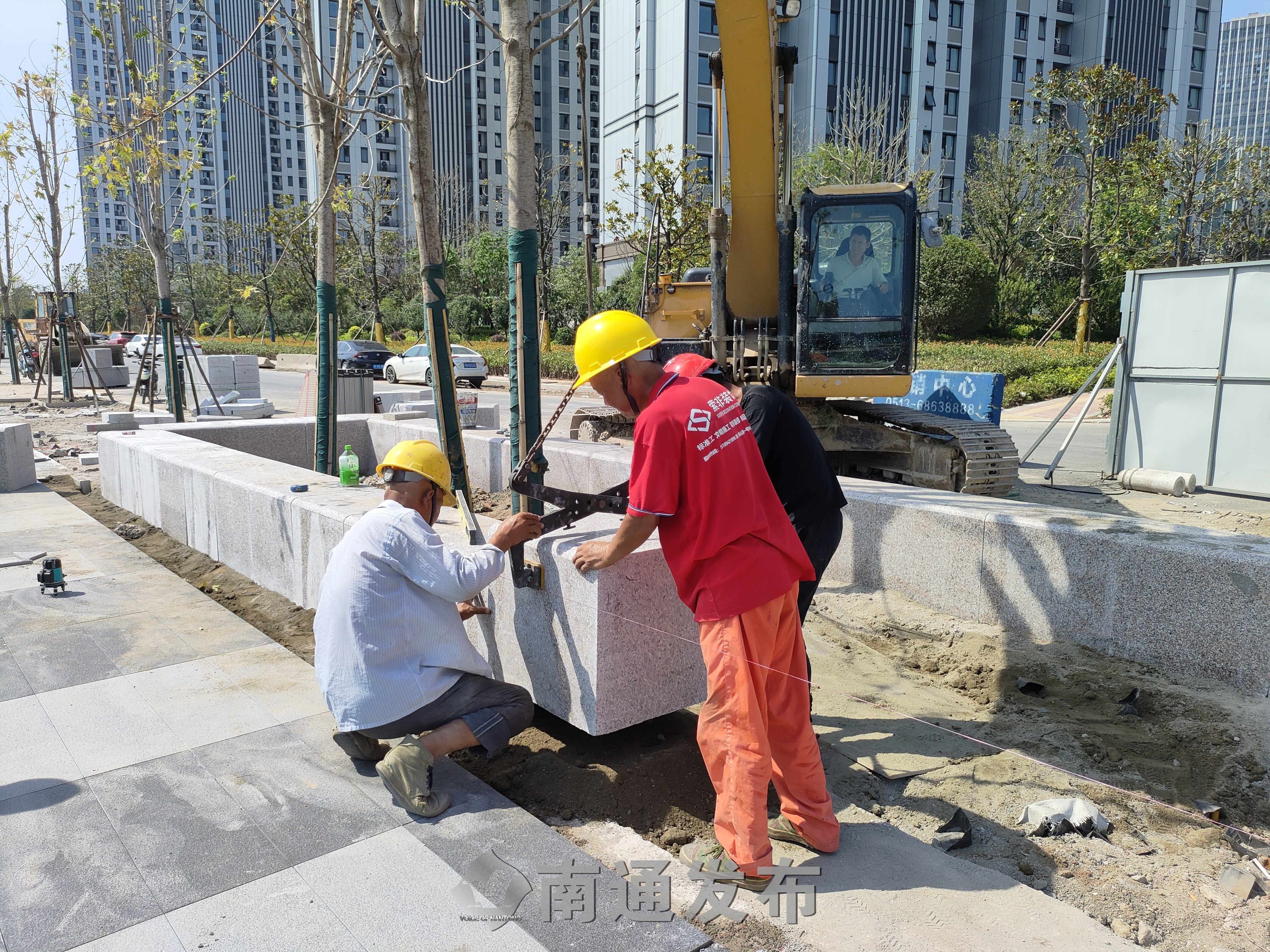 新建的城闸路长约840米、宽18米,将现有的城闸路与船闸东路进行连接。在新城闸路北侧靠近通扬运河河边,3名工人正在进行石凳安装。只见其中1名工人挥着铁锹,把砂浆填充到需要安装石凳的花圃上;随后,另1名工人把吊机爪子安牢在堆砌在周边的其中一张石凳上,随着吊机缓缓上升、移动,这张石凳成功转移到了设计所在的安装点。为了确保所有石凳规整齐平,剩下1名工人拿起水平尺现场进行了测量,刚才的2名工人又拿起榔头,左右上下敲动调整,大约用了10分钟时间,才彻底完成一张石凳的安装。此时,3名工人的额头已然渗出了豆大的汗珠。